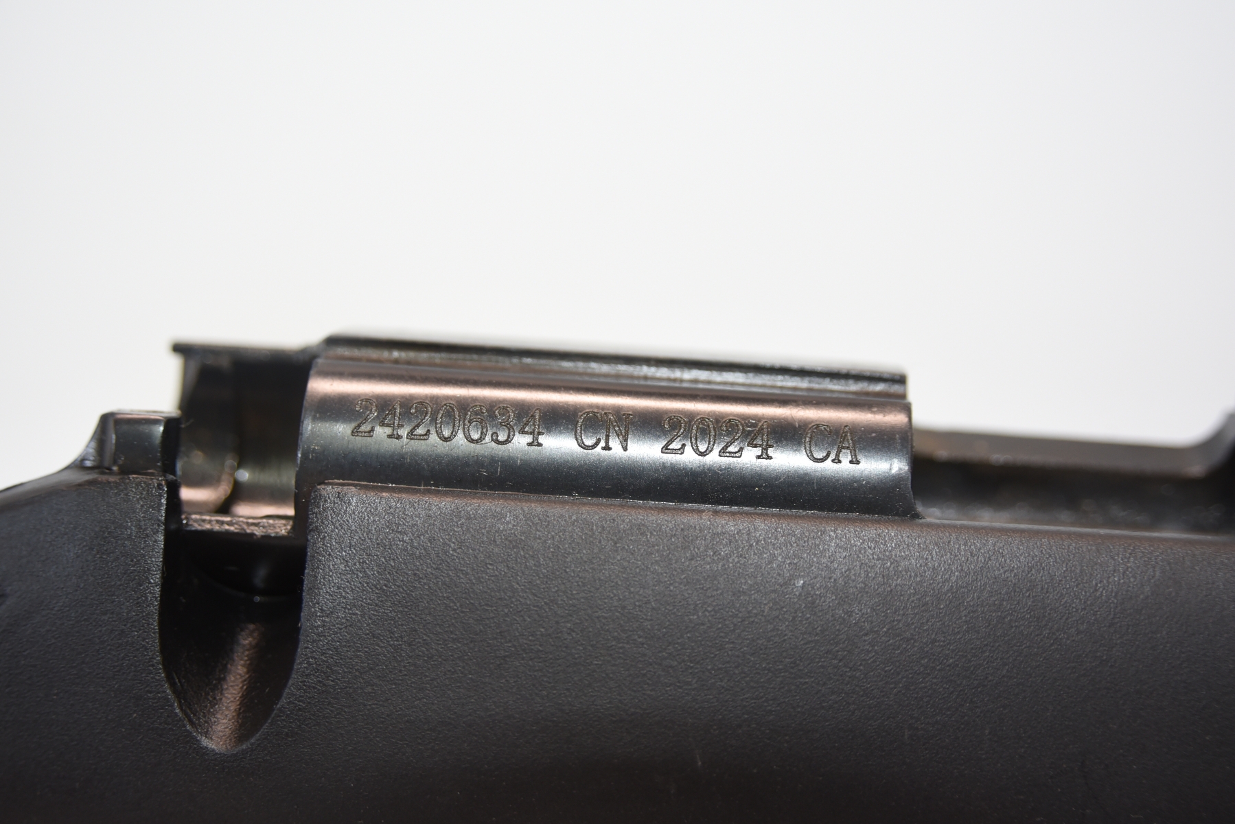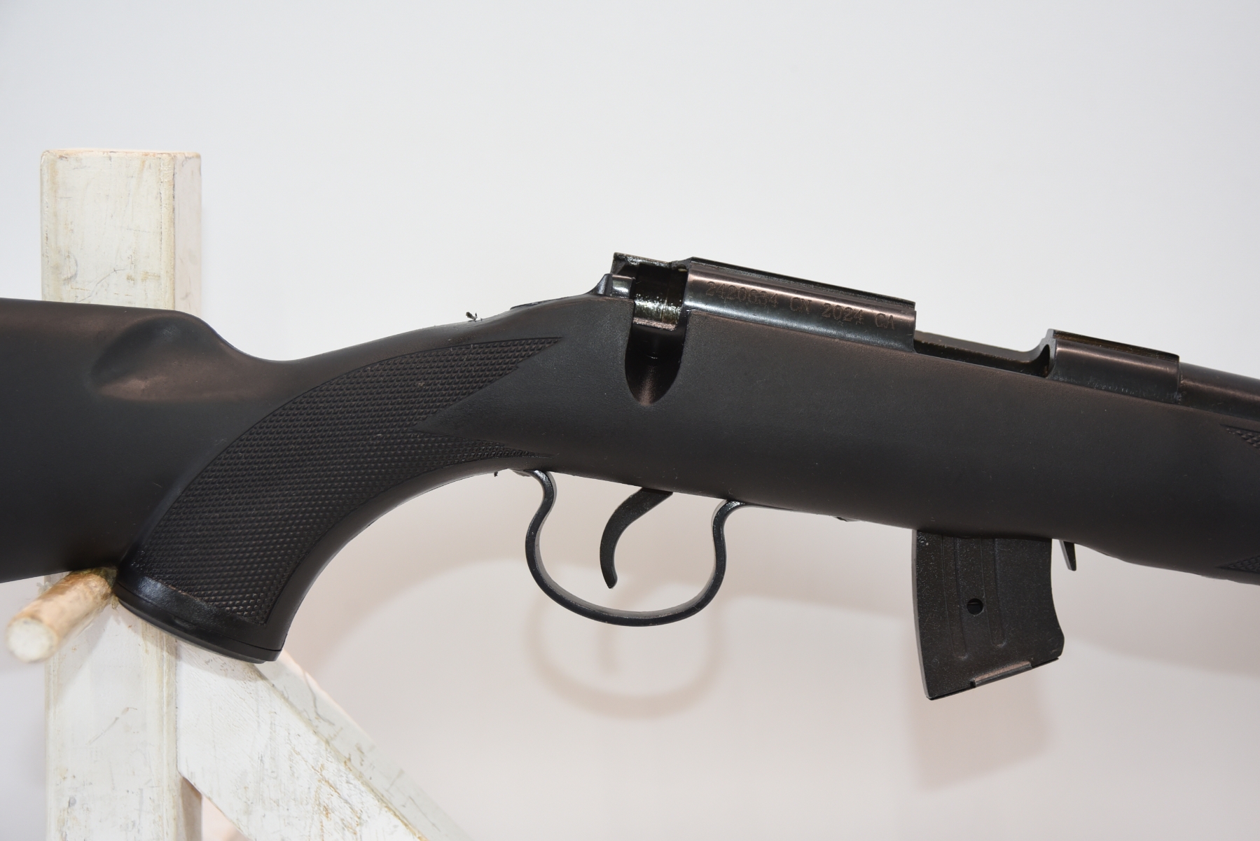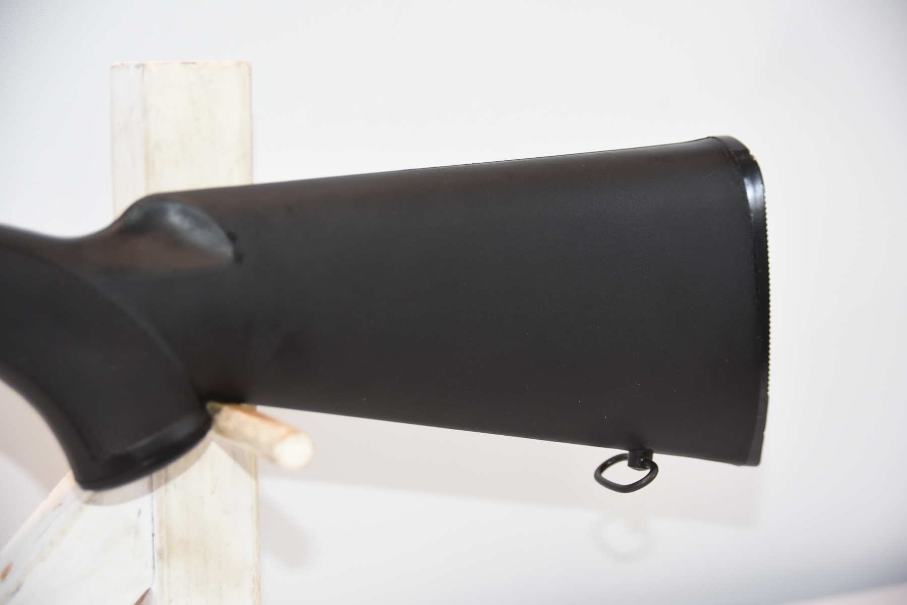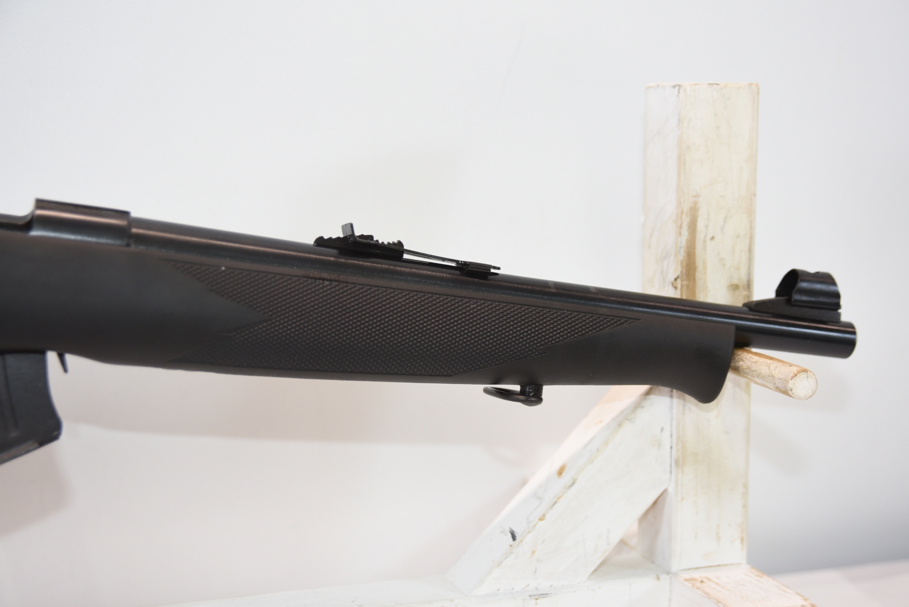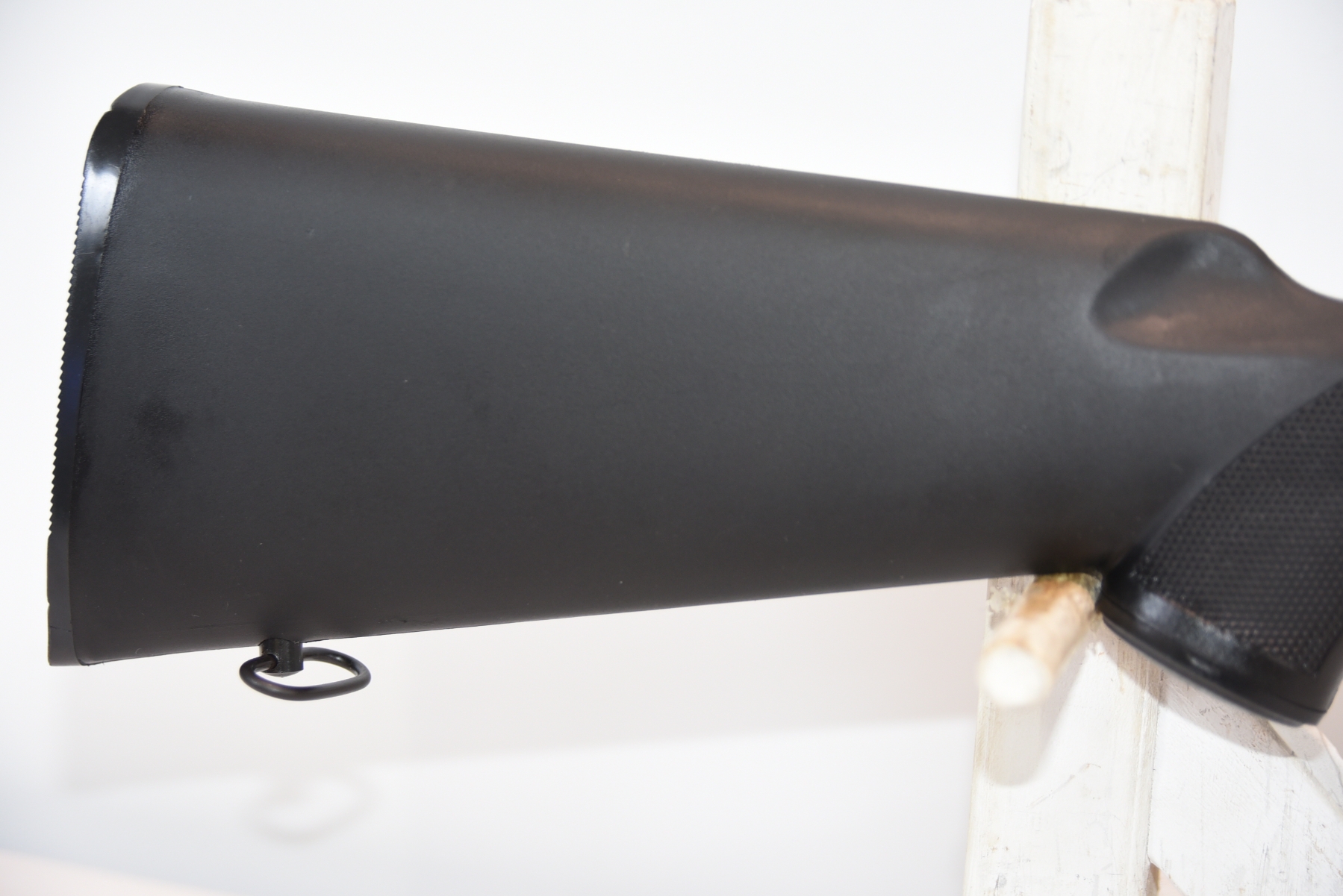 The black synthetic stock has minimal scratching on both sides. There does not appear to be a safety on the firearm. This firearm is missing the bolt. The black synthetic stock also has minimal scratching on both sides. Firearm has swivel rings. The shiny bluing has some scratching. Magazine comes with the firearm. Has sights. The bore is shiny with visible rifling.
