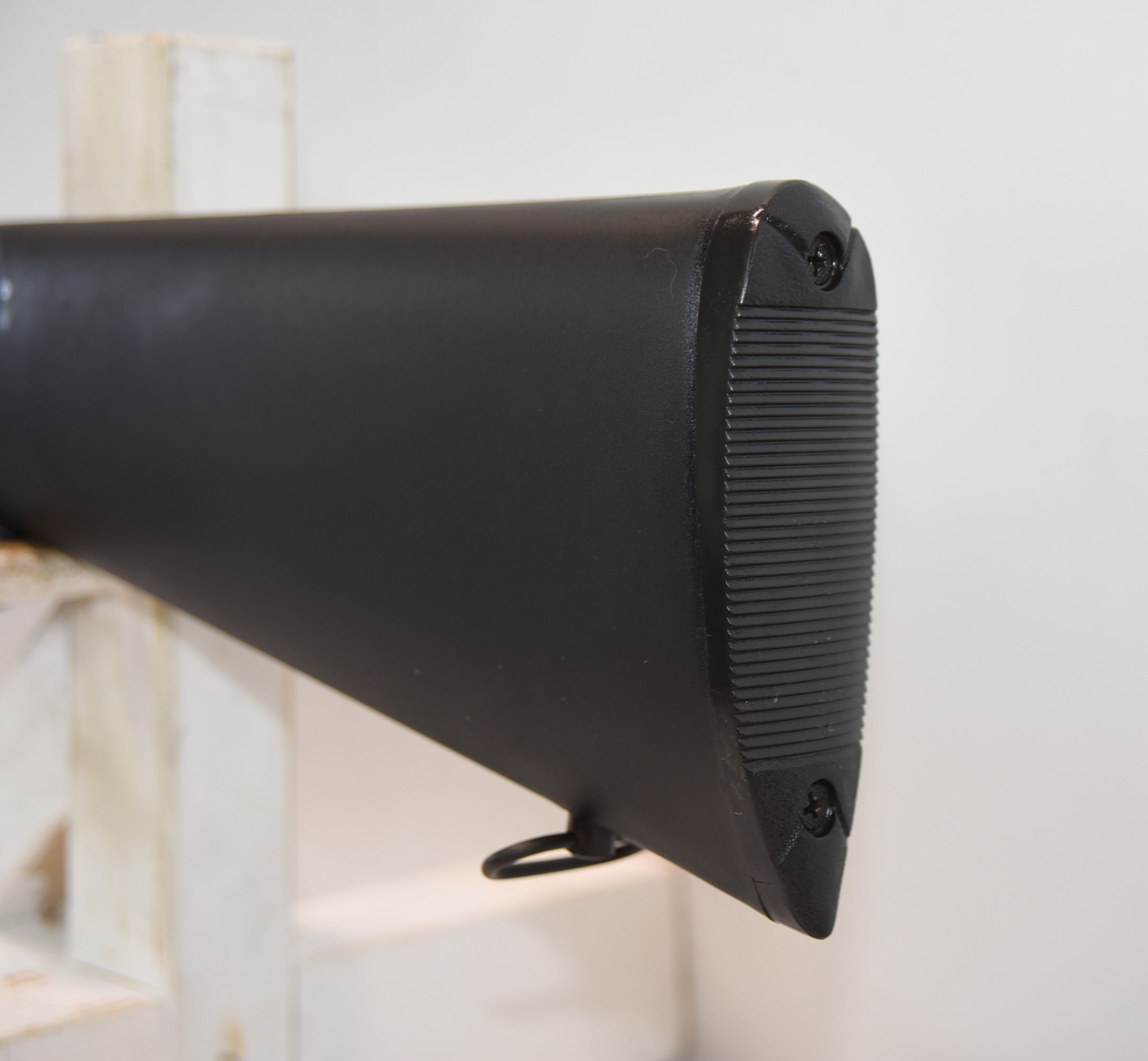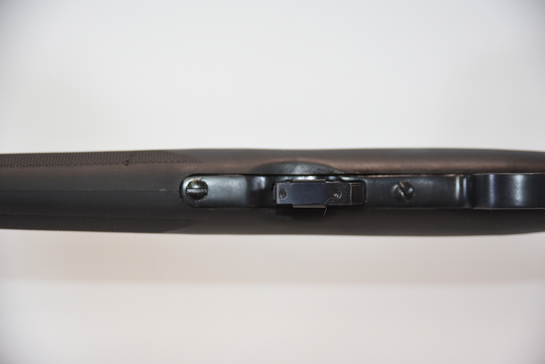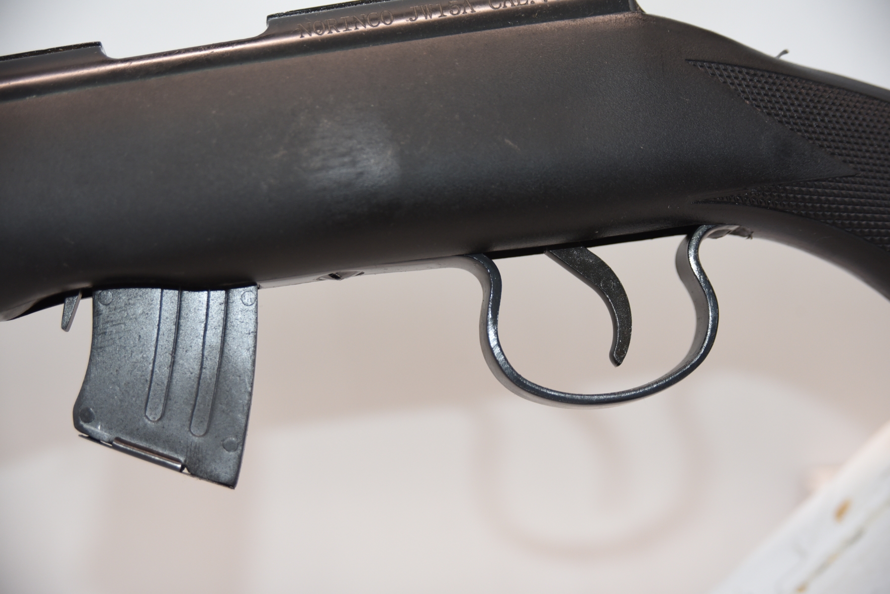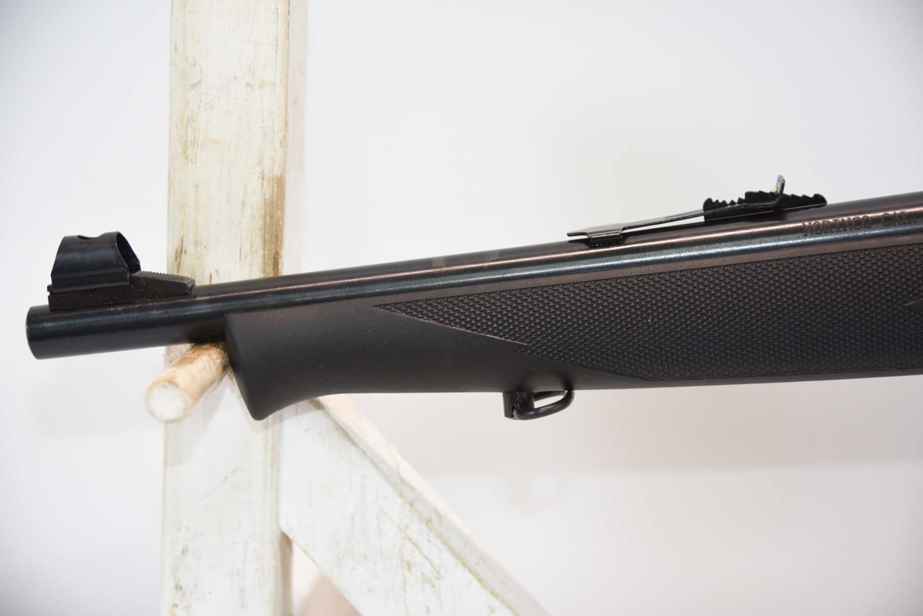 The black synthetic stock has minimal scratching on both sides. There does not appear to be a safety on the firearm. This firearm is missing the bolt. The black synthetic stock also has minimal scratching on both sides. Firearm has swivel rings. The shiny bluing has some scratching. Magazine comes with the firearm. Has sights. The bore is shiny with visible rifling.