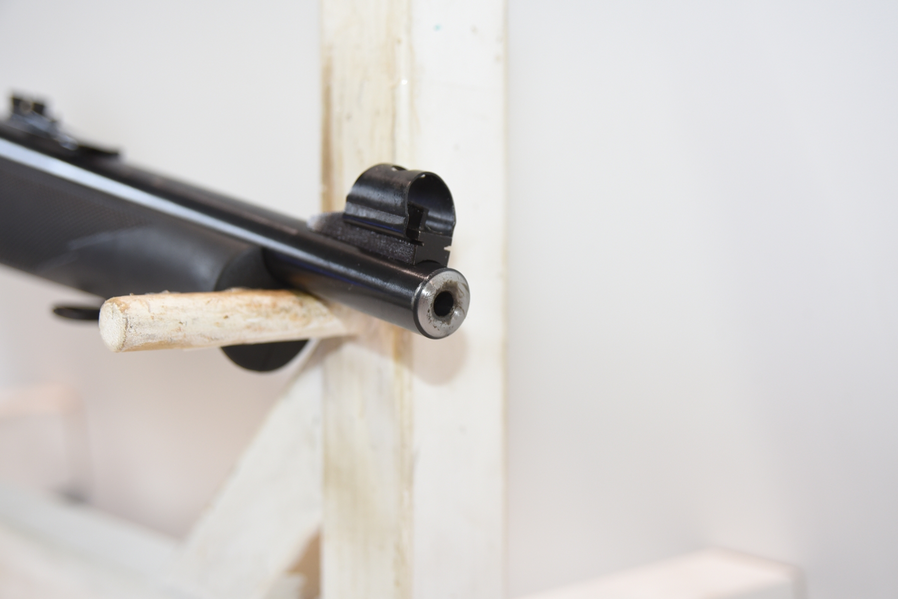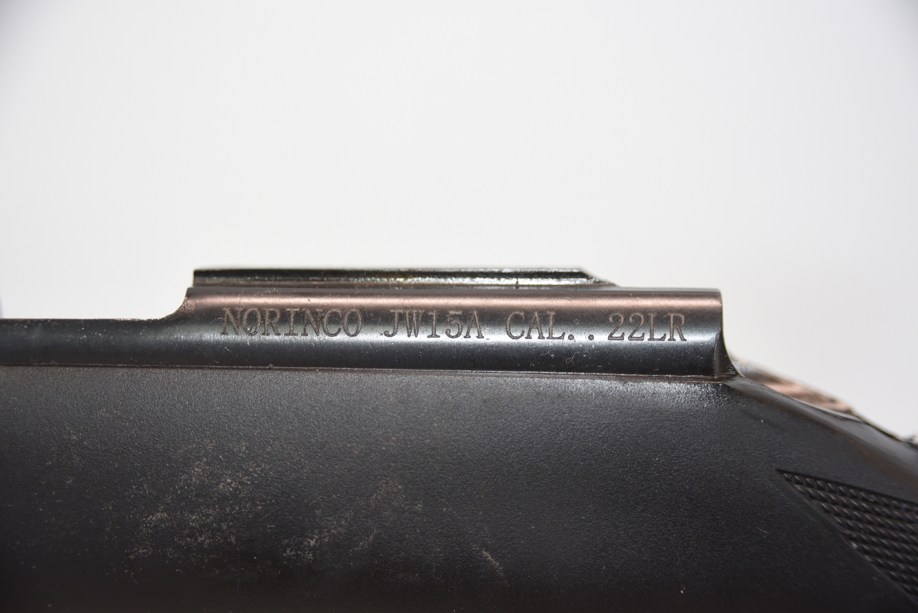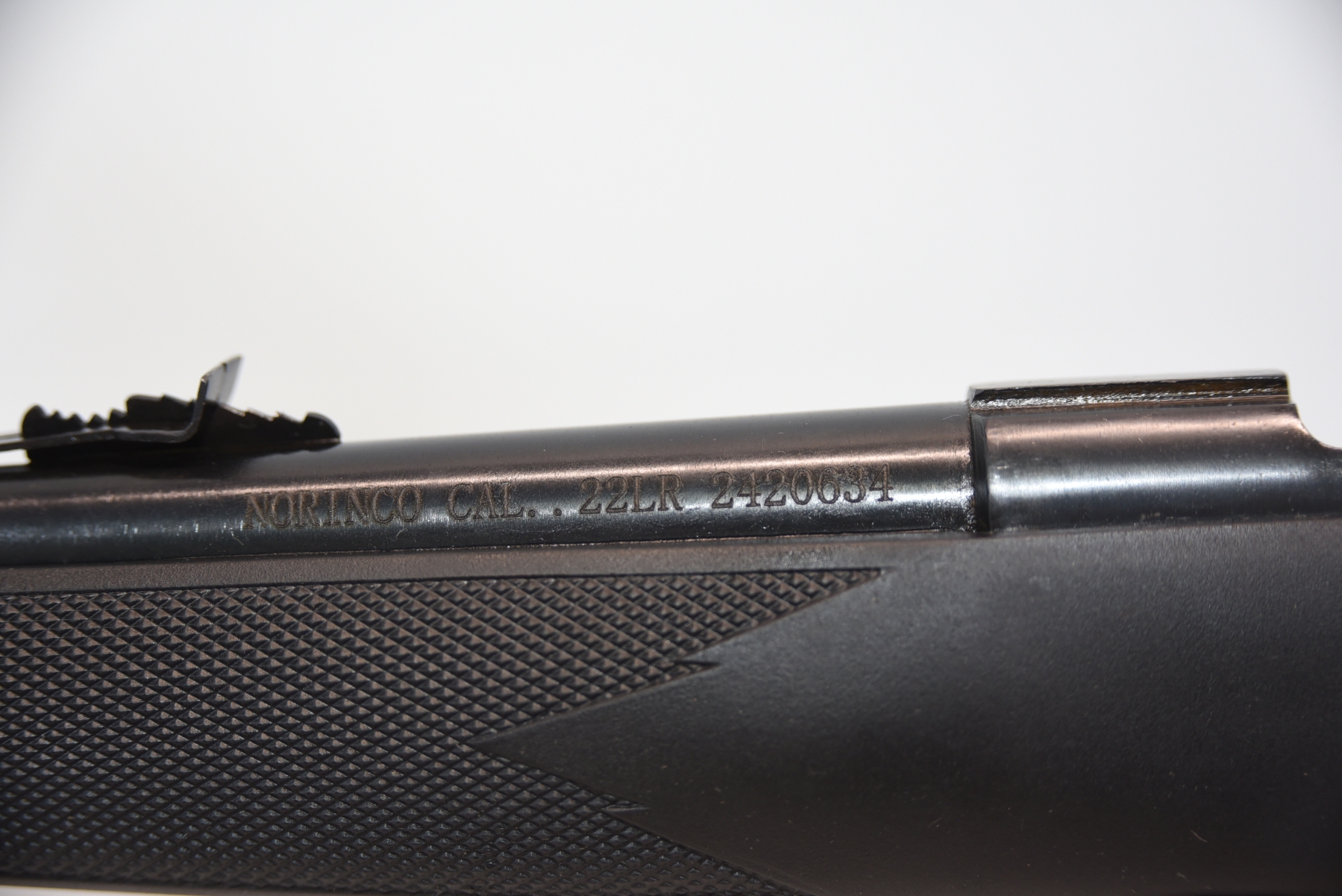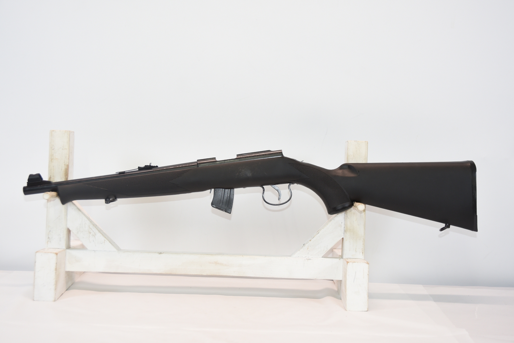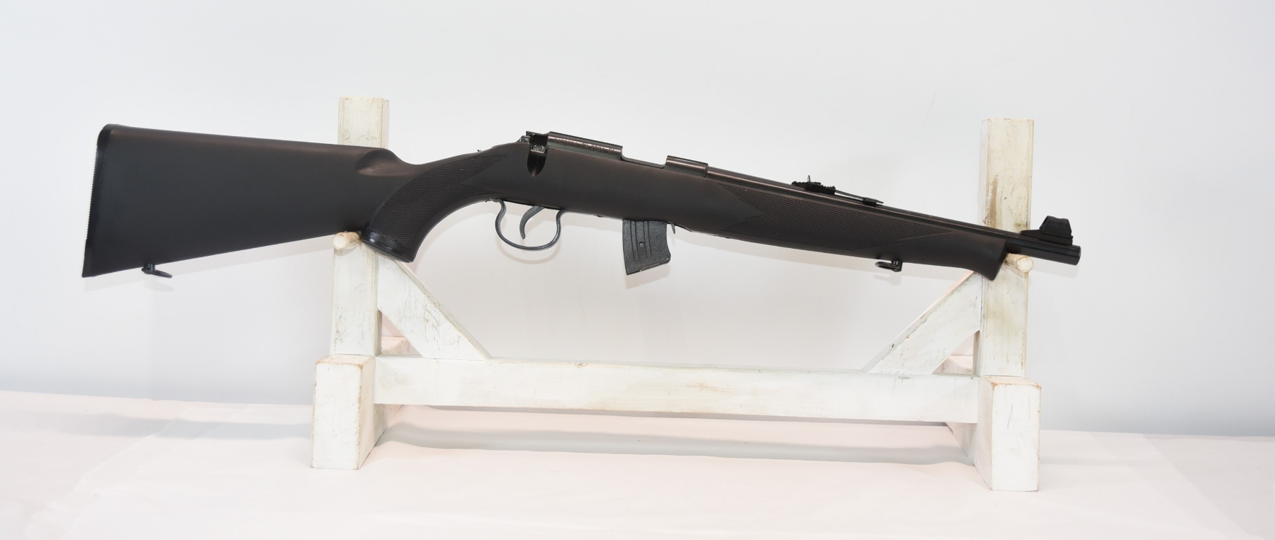 The black synthetic stock has minimal scratching on both sides. There does not appear to be a safety on the firearm. This firearm is missing the bolt. The black synthetic stock also has minimal scratching on both sides. Firearm has swivel rings. The shiny bluing has some scratching. Magazine comes with the firearm. Has sights. The bore is shiny with visible rifling.