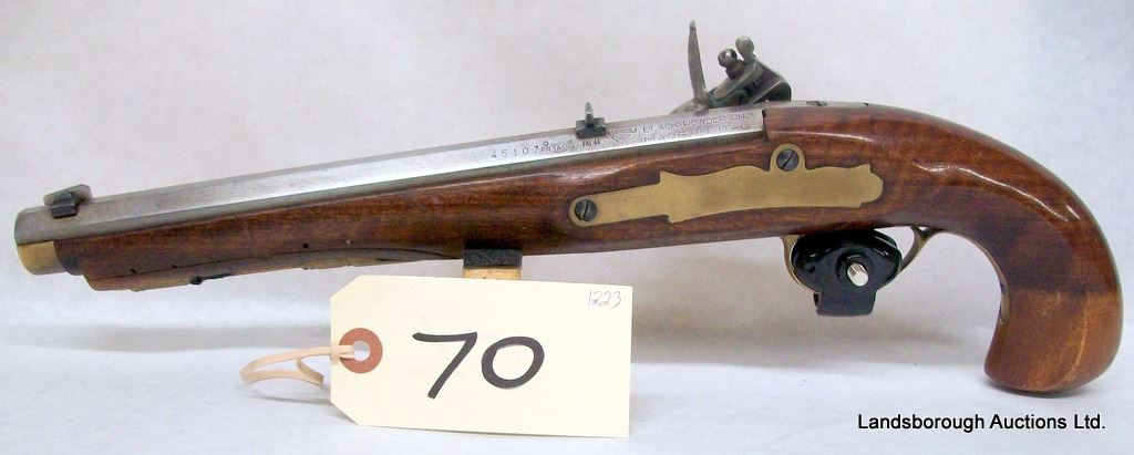 RESTRICTED, SINGLE SHOT, 44 FLINTLOCK, 262MM BARREL, SN 45107. WOOD HAS NUMEROUS SCRATCHES, BLUING IS GONE, CASE HARDENING EVIDENT ON LOCK, BRASS HAS SOME TARNISH, BORE GOOD. RAM ROD BROKEN.