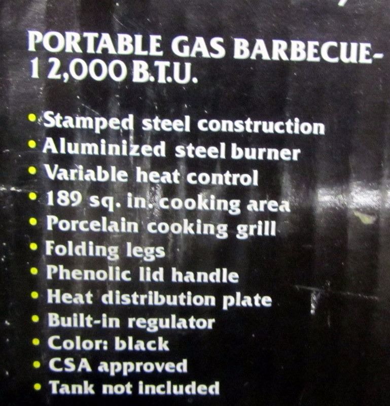NEW IN BOX, NEVER USED. 12,000 BTU OUTPUT, 189 SQUARE INCHES OF COOKING SPACE.