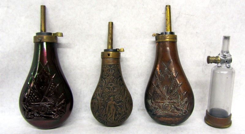 3 METAL POWDER FLASKS. 1 CLEAR POWDER MEASURE.