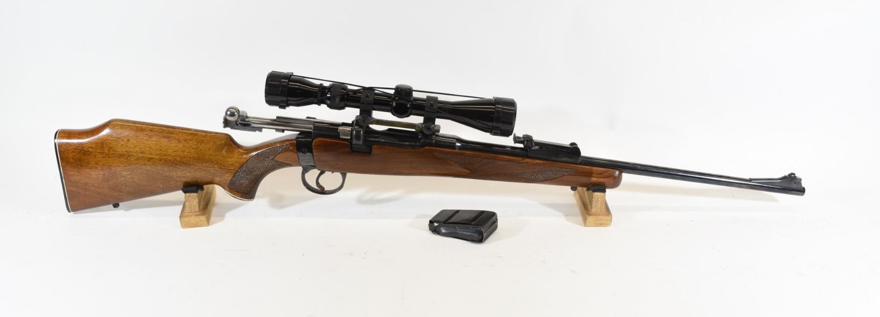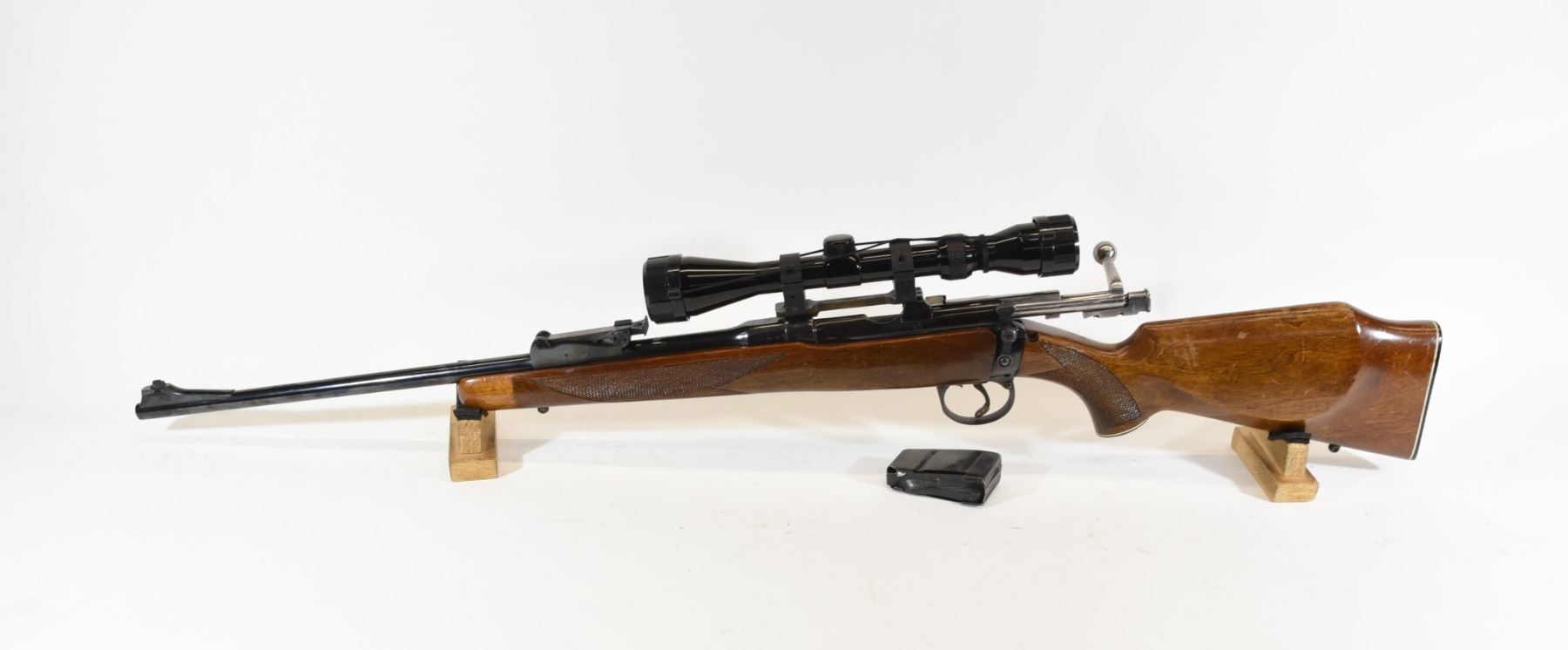 Non-restricted, bolt action, 303 British, 22" barrel, SN 8125. Wood has some handling marks, bluing is very good, bore is a little dark rifling is prominent. Has a Tasco 3-9x40 scope.