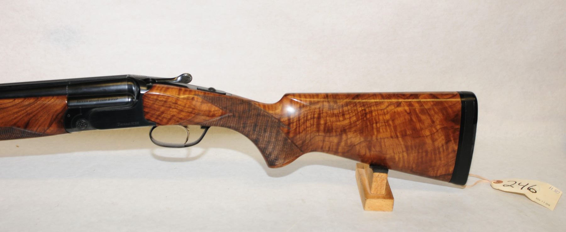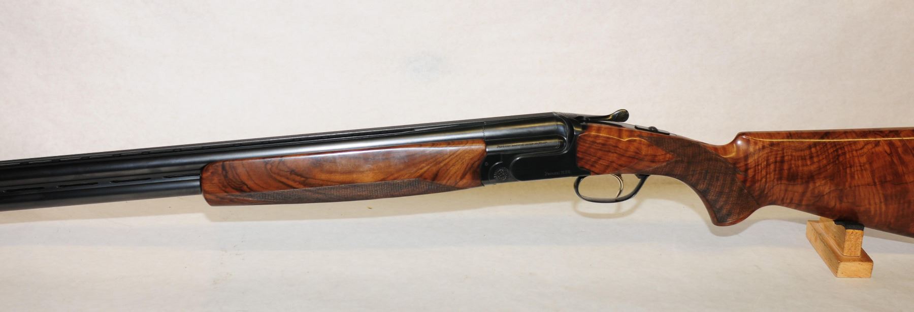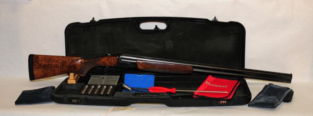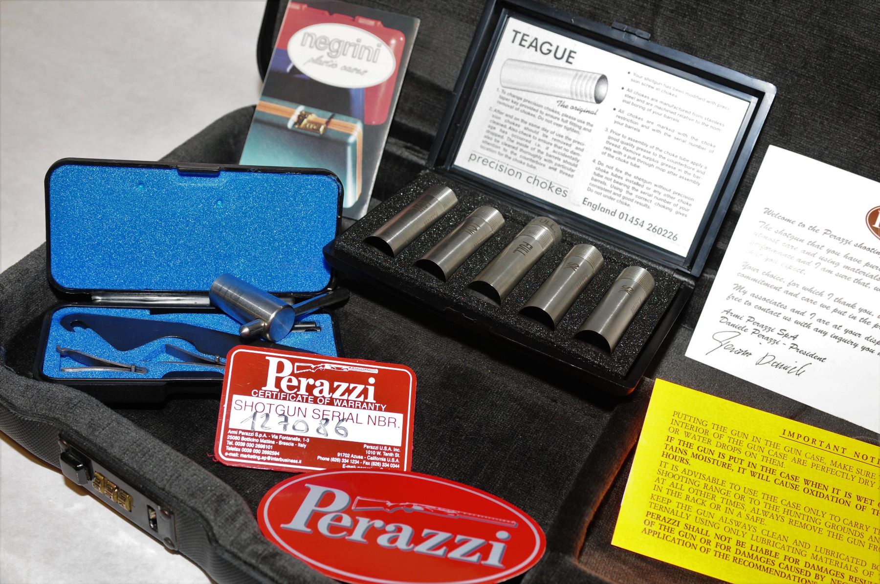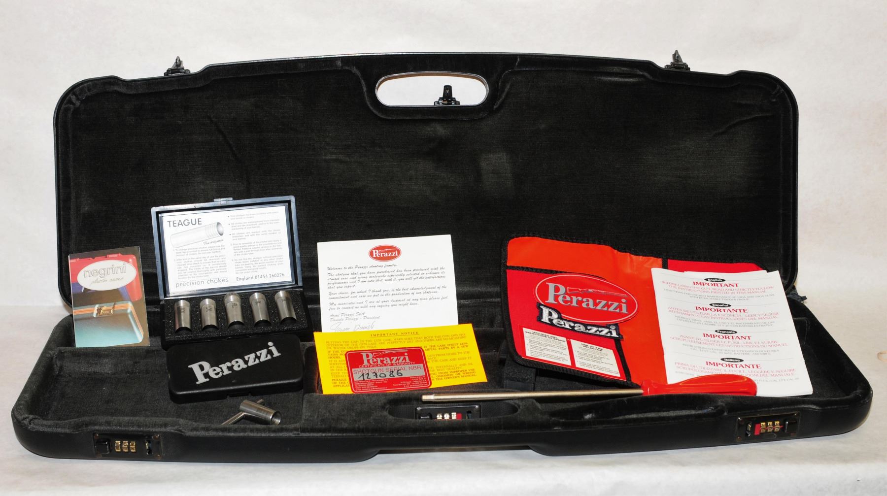 Non-restricted, multi barrel o/u, 12Ga x 2 3/4", 31 1/2" barrels with removable chokes (F,M,IM,IC,IC,SKT,SKT), SN 127086, wood is very good, bluing is very good, bores are excellent, gun has upgraded SCO wood, it has a trigger spring kit and comes with a total of seven Teague choke tubes and wrench, gun also comes in an original Perazzi lockable hard case.