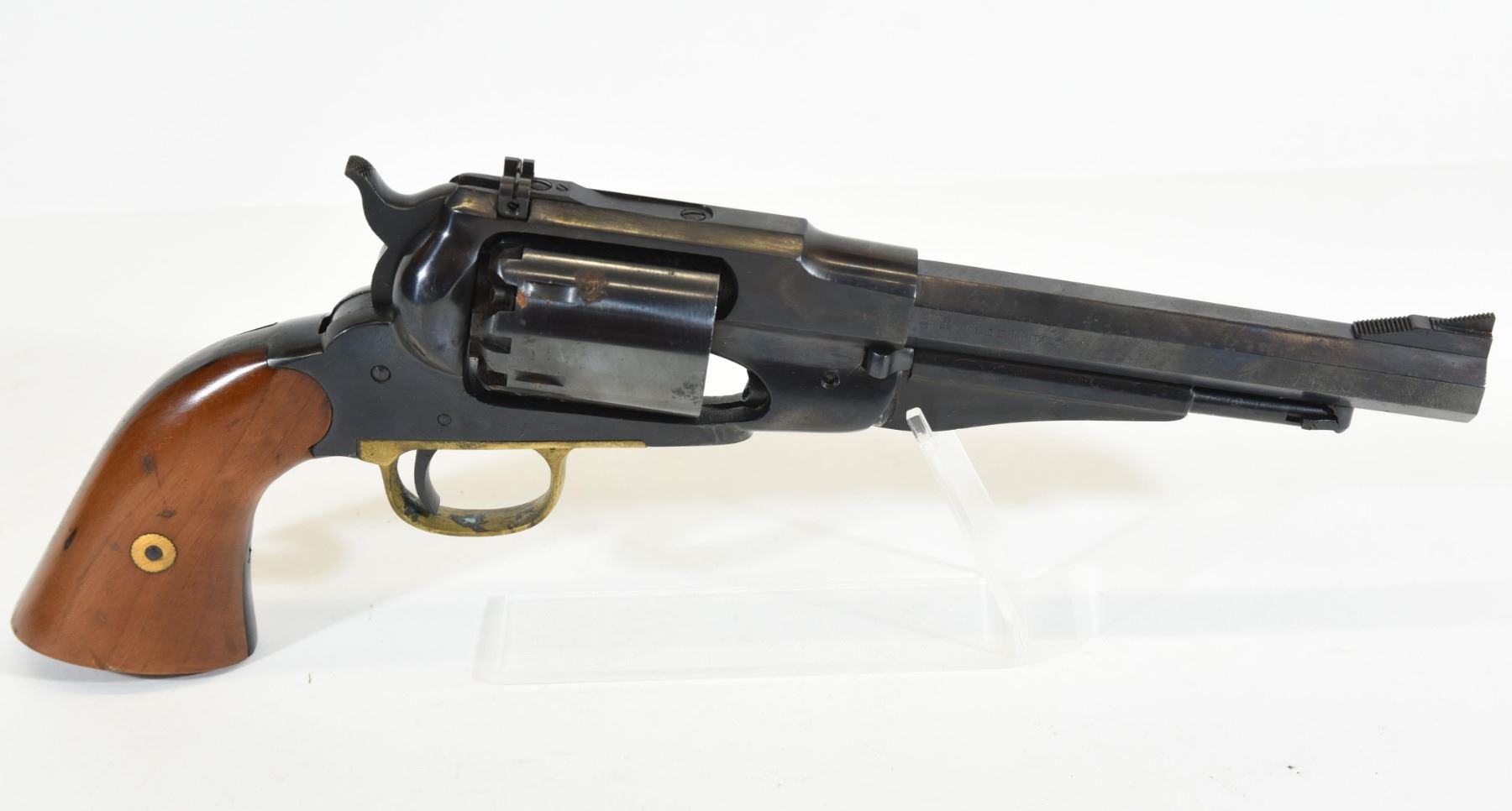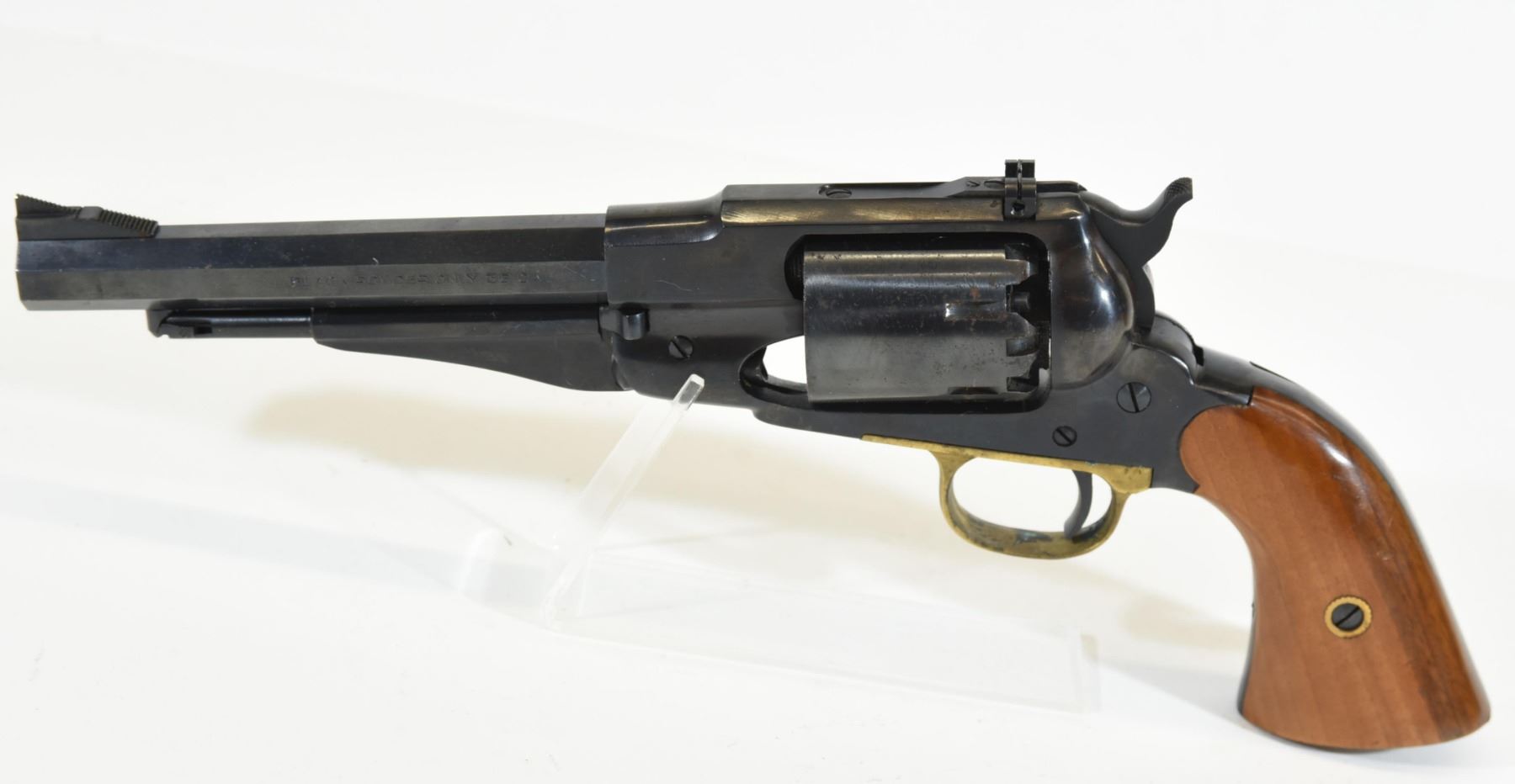 Restricted, revolver, 36 Percussion, 170mm barrel. SN 095217. Wood grips have some marks, bluing has pitting on cylinder, brass guard is tarnished, bore has corrosion.