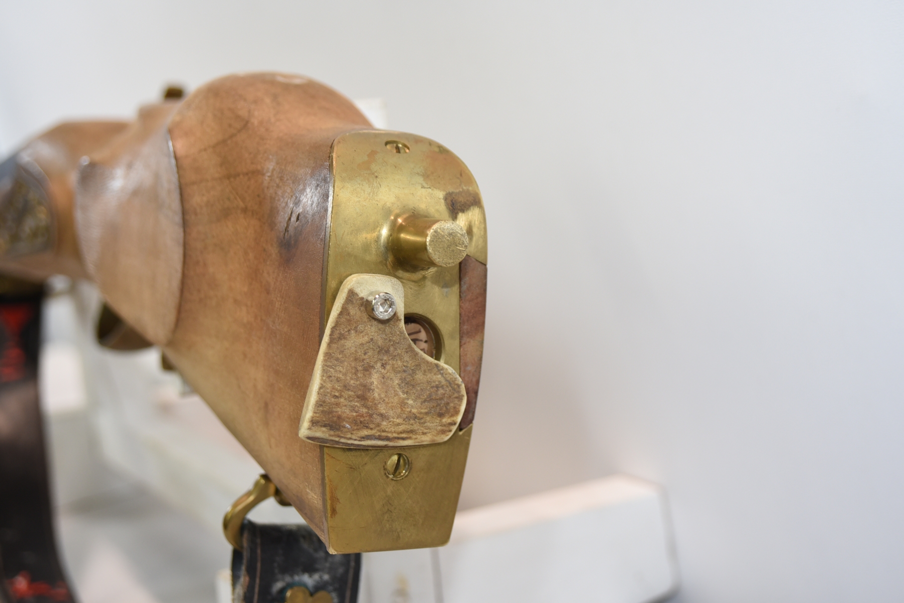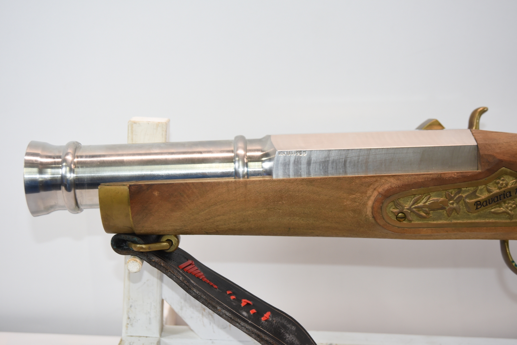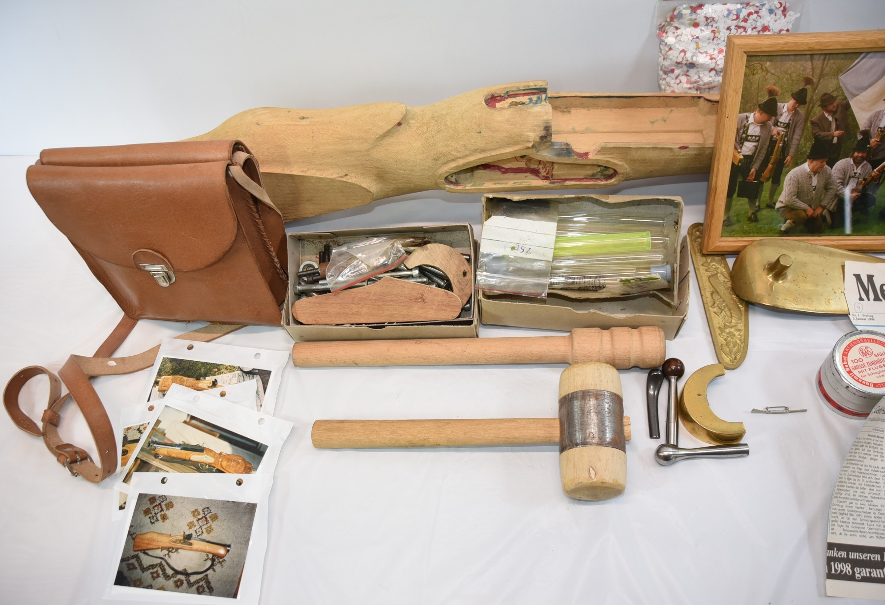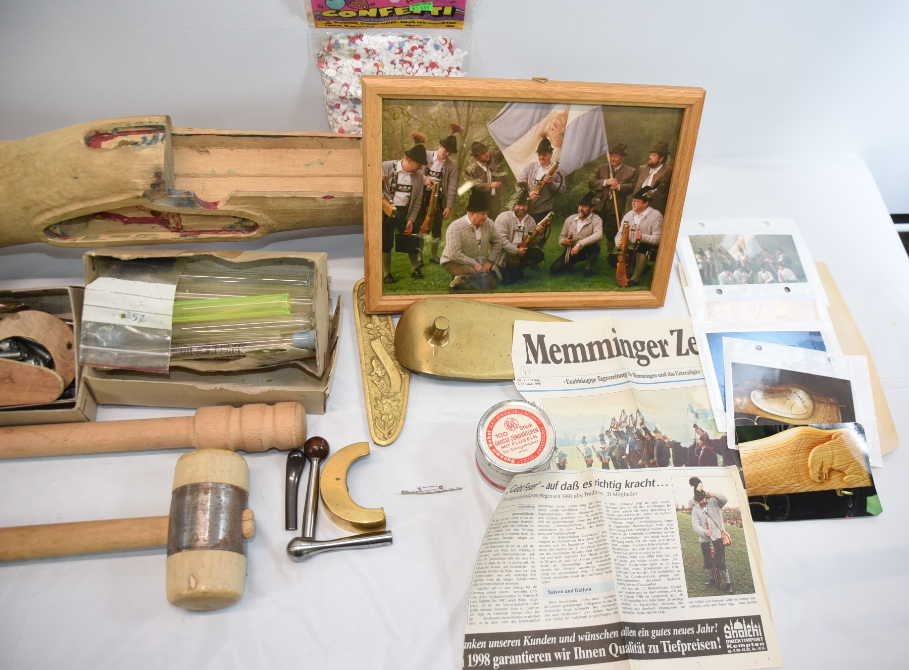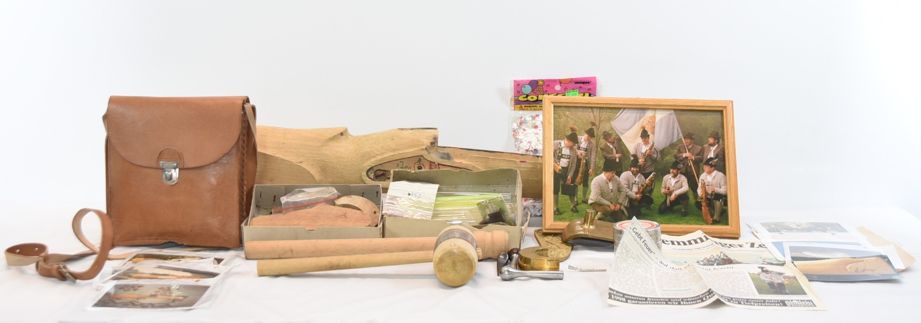 Item comes with a bag of confetti, spare unfinished stock, pictures of events in Europe at events, corks, leather bag with corks, 3 containers of percussion caps (unknown quantity), wooden mallet, push rod, spare brass butt plate, side plate, forearm cap, two boxes of spares, news clippings (German), photos.