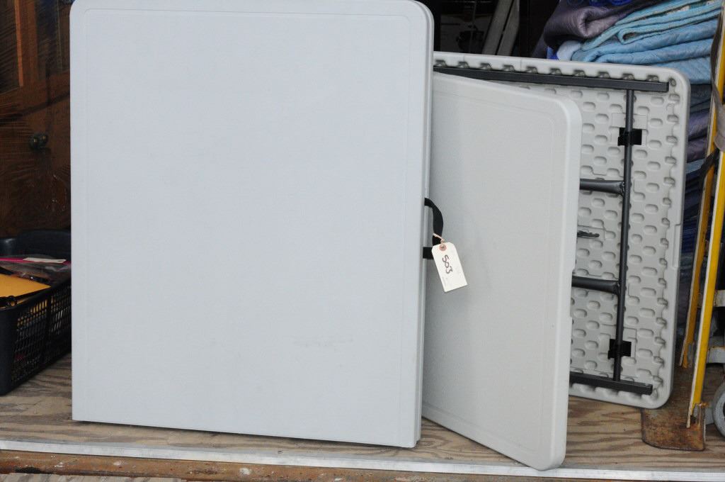 2 plastic gray folding tables , NO SHIPPING ON THIS ITEM MUST PICK UP