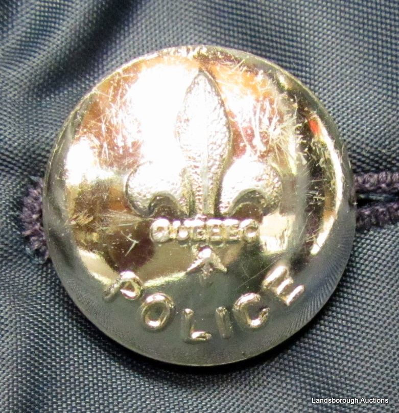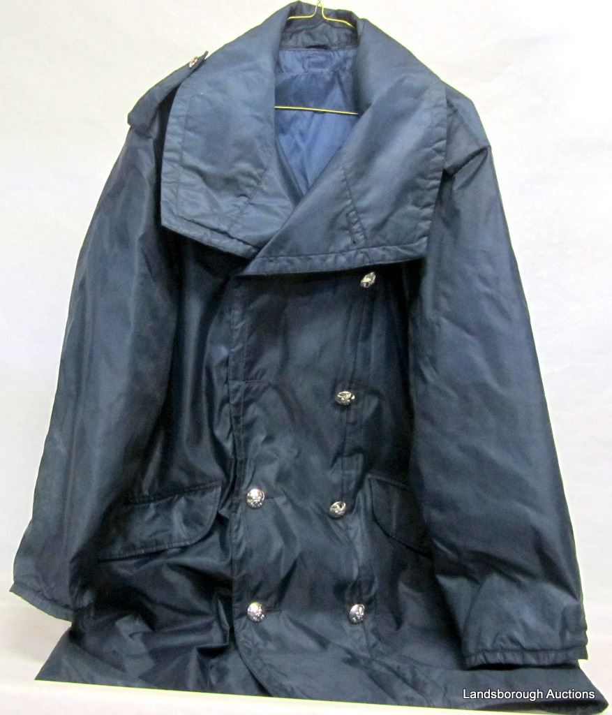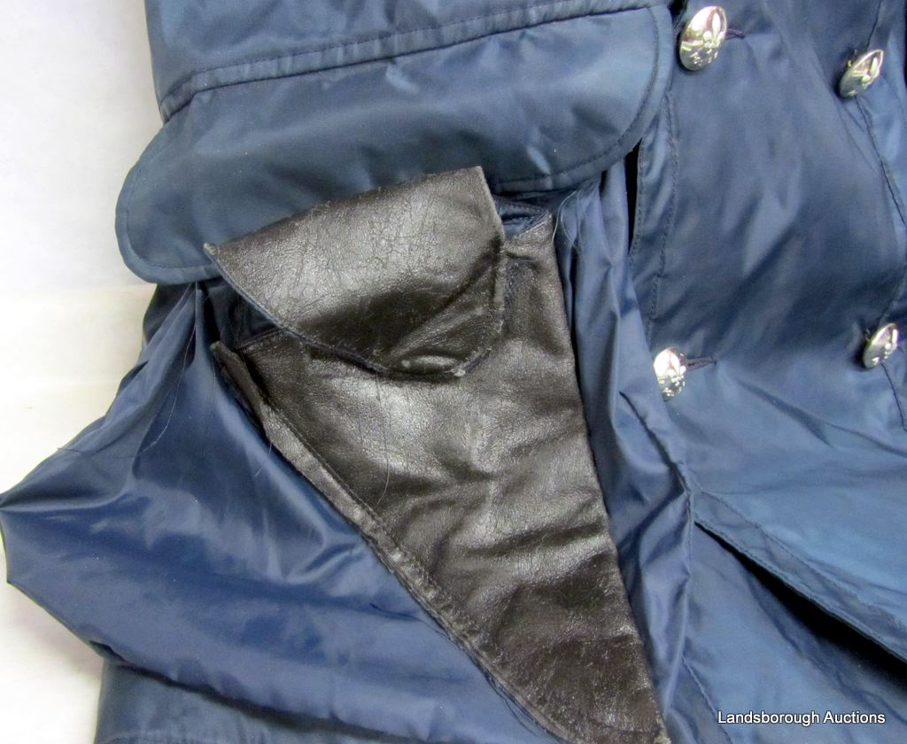 MENS LARGE. NYLON COAT WITH FLEUR DE LIS BUTTONS AND INSIDE PISTOL POCKET. MISSING ONE BUTTON.