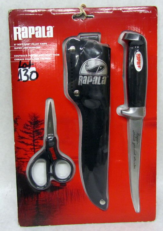 NEW IN PACKAGING, 6" RAPALA FILET KNIFE WITH SHEATH AND FISHING SCISSORS.