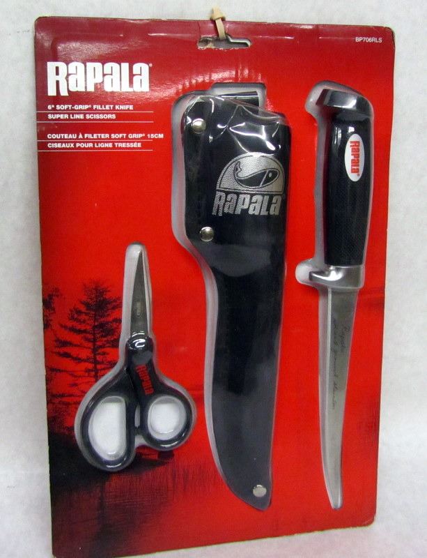 NEW IN PACKAGING, 6" RAPALA FILET KNIFE WITH SHEATH AND FISHING SCISSORS.