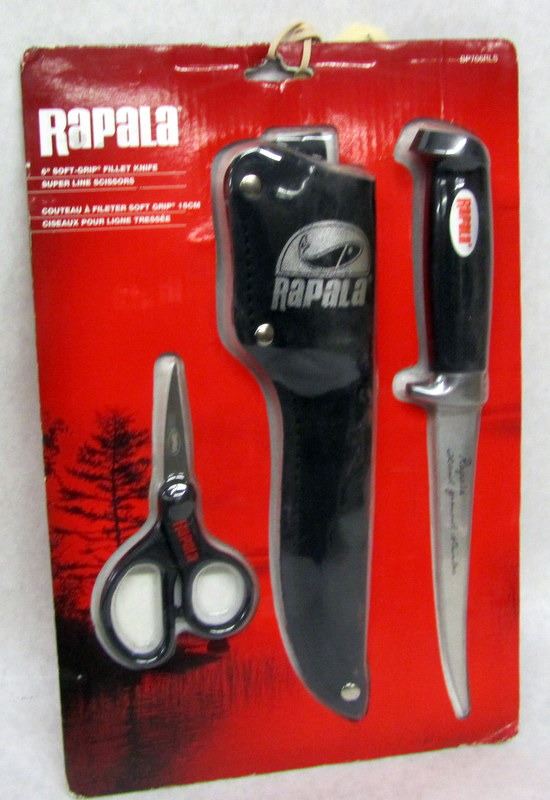 NEW IN PACKAGING, 6" RAPALA FILET KNIFE WITH SHEATH AND FISHING SCISSORS.