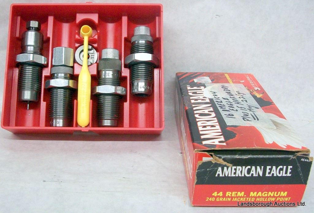 ONE LEE DELUXE PISTOL DIE SET IN .44 SPECIAL (CAN LOAD .44 MAGNUM) PLUS 15 RNDS AMERICAN EAGLE 44 REM MAG, AND 16 RNDS HORNADAY 44 REM MAG