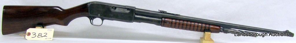 NON-RESTRICTED, PUMP ACTION, 25 REM, 22" BARREL, SN 118120. WOOD SANDED BELOW METAL, BLUING IS GREY AND WORN, BORE STAINED. MISSING MAGAZINE INSIDES AND BUTT PLATE.