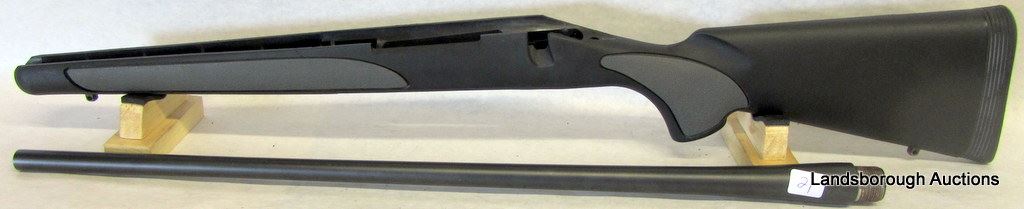 LEFT HANDED STOCK, BLACK SYNTHETIC, WITH GREY RUBBER GRIP PANELS. 26 INCH BLUED BARREL IN 7MM REM MAG