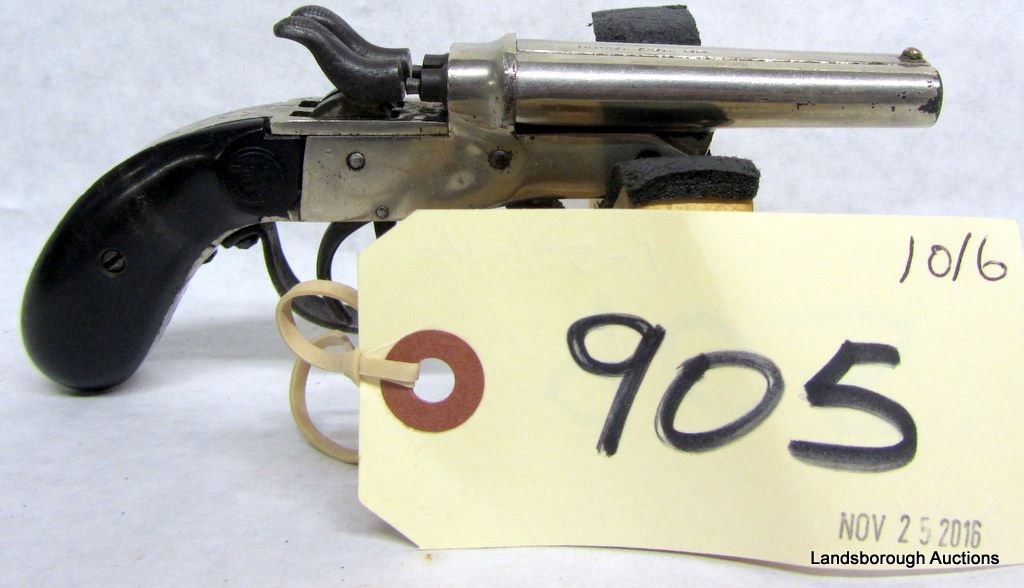 PROHIBITED, MULTI BARREL, 22LR, 70MM BARREL, SN E293335. GRIPS HAVE SOME MARKS, NICKEL PLATING HAS PITTING, BORES HAVE SOME PITTING.