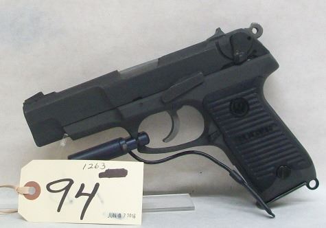RESTRICTED, SEMI AUTO, 9MM LUGER, 110MM BARREL, SN 30077687. PLASTIC GRIPS HAVE SOME MARKS, MATTE METAL FINISH HAS SOME SCRATCHES, BORE EXCELLENT. LASER LIGHT SIGHT.