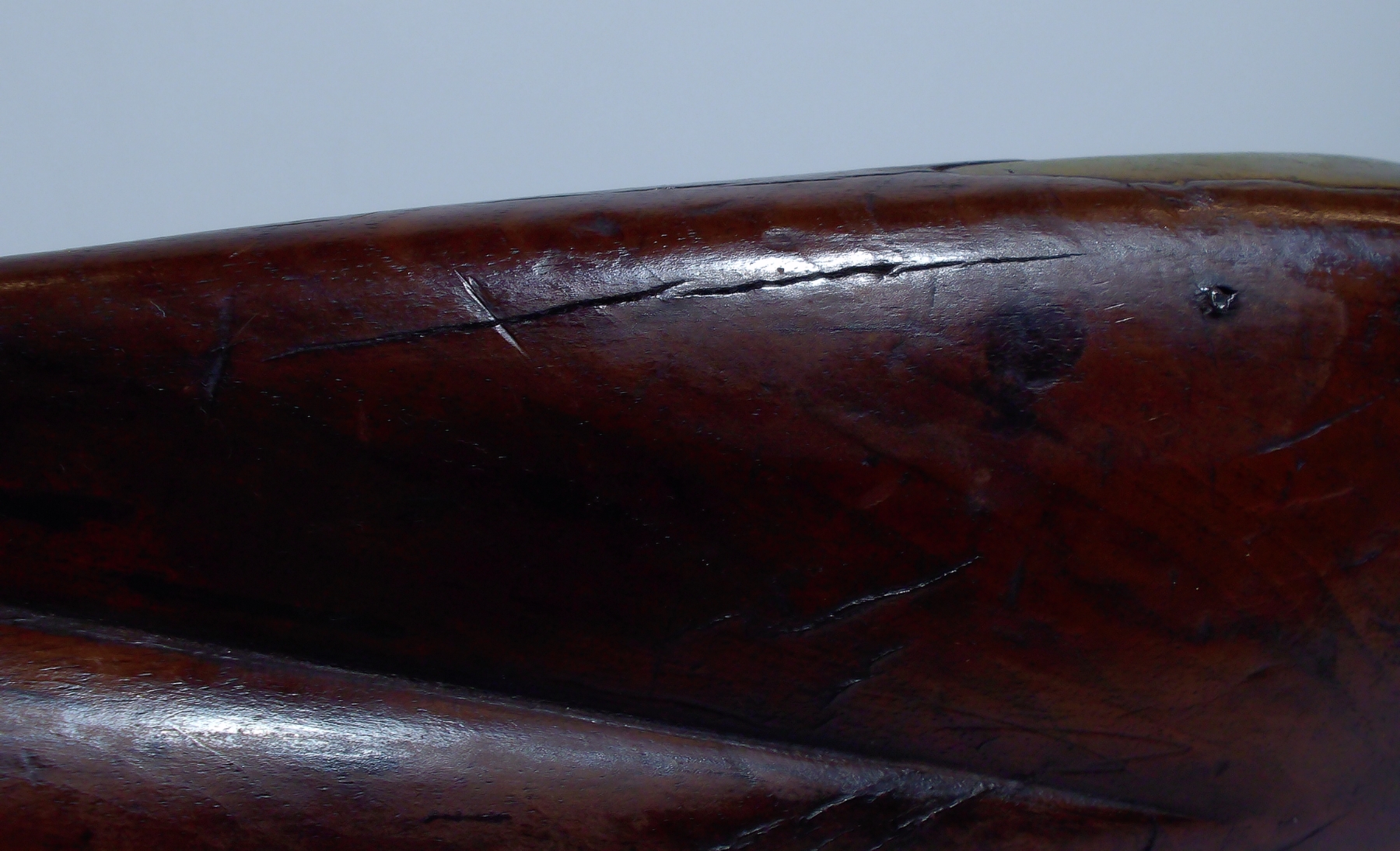 Wood stock shows dents, scratches and scuffs in various areas throughout. There are few repairs, there are cracks in the following areas: behind the top part of grip, a crack/break on either side of the trigger area, a repair spot in the forearm, a chip in the forearm; condition is fair for age.
