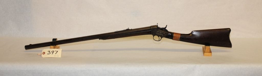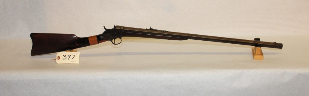 Non-restricted, single shot, 32 RF, 26" octagonal barrel, SN 7167. Wood wrist broken, bluing is brown, bore pitted.