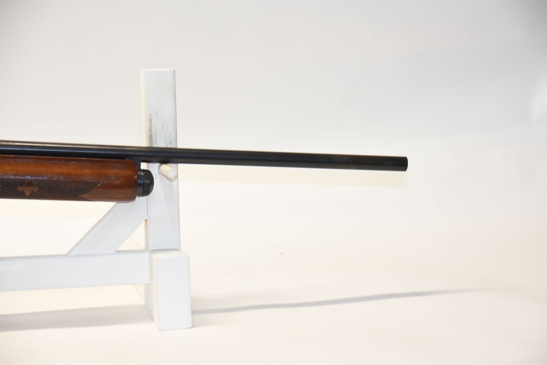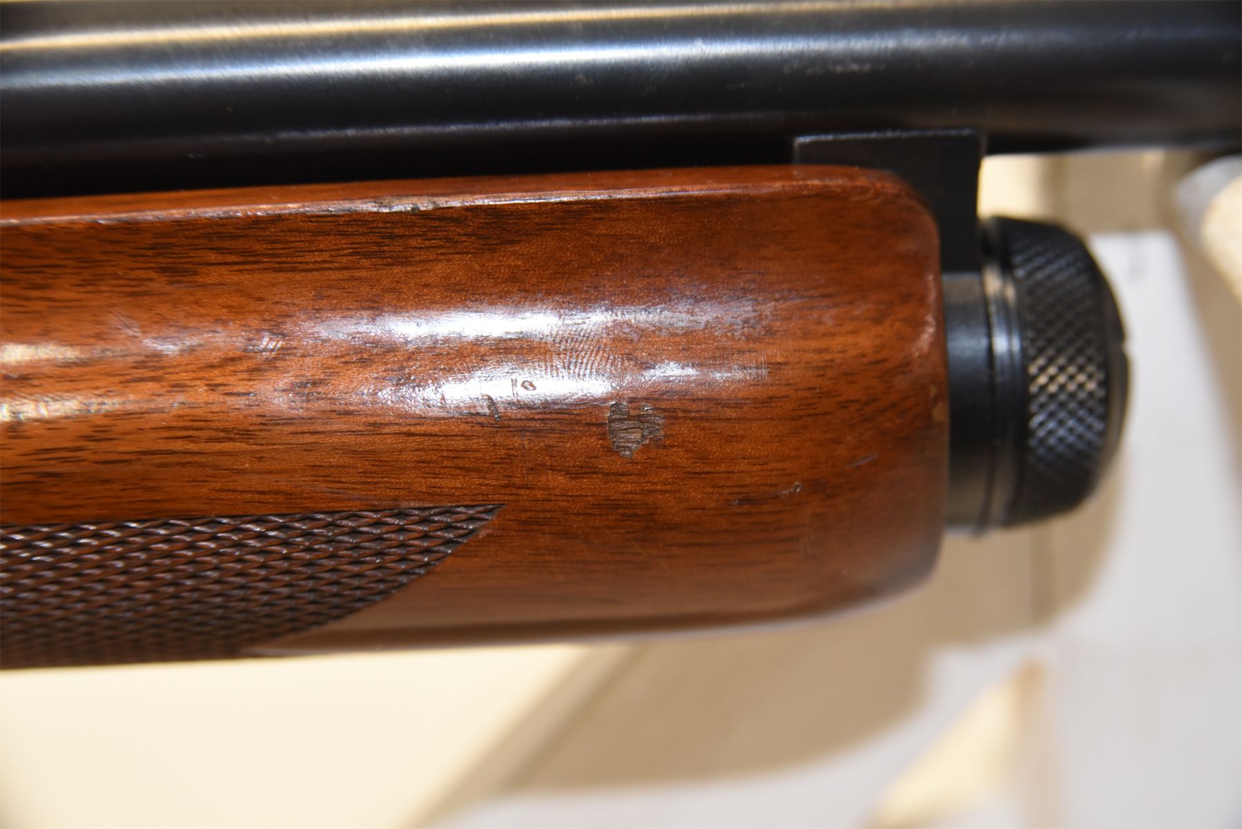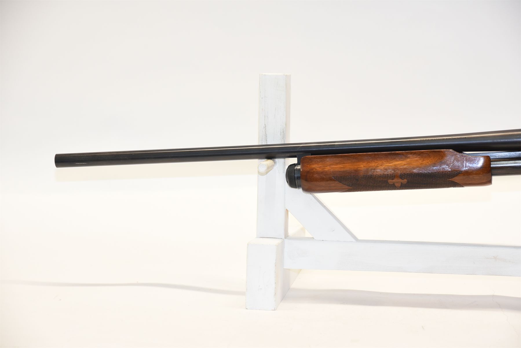 Barrel has been cut. Wood has scuffs, scratches, and dents. Condition is good. Bluing has wear in areas, patina present, scratches, and scuffs. Condition is good. Bore is excellent.