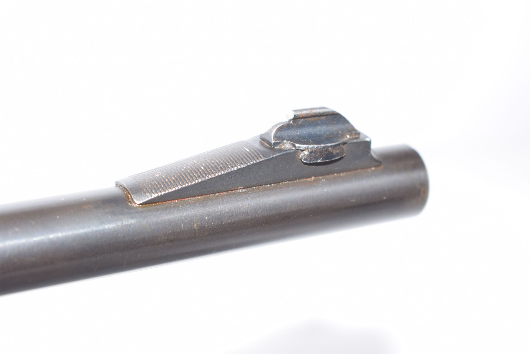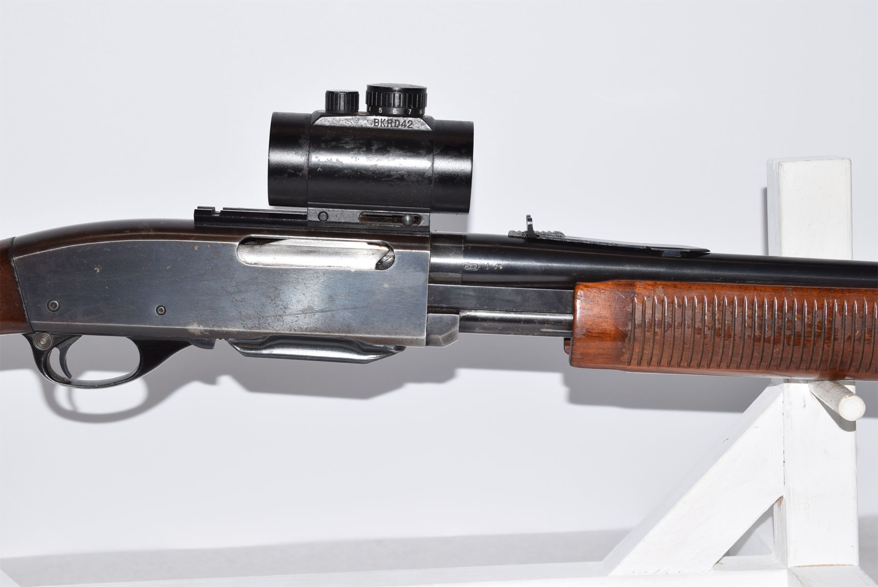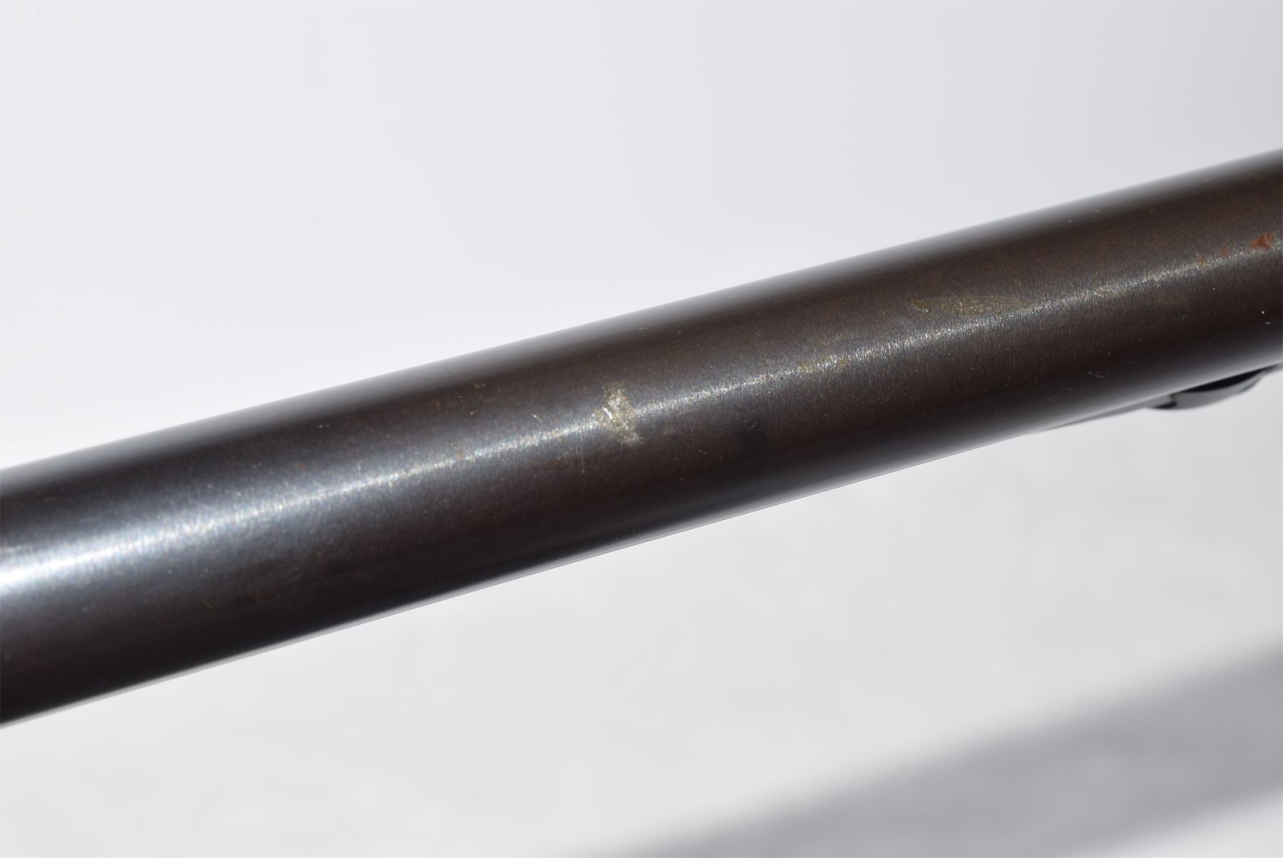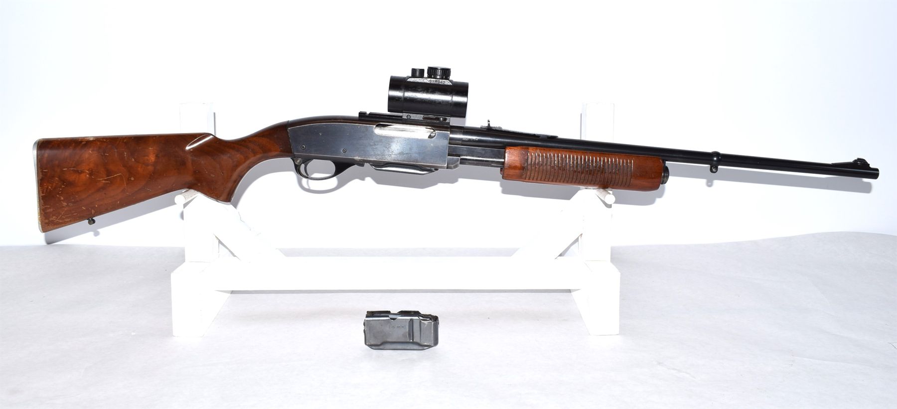 Wood has scratches, dents, scuffs, and lots of finish wear spots. Condition is fair. Bluing shows finish wear, scuffs, and light scratches. Condition is fair. Bore is excellent. Comes with Tasco Red Dot and an extra magazine.