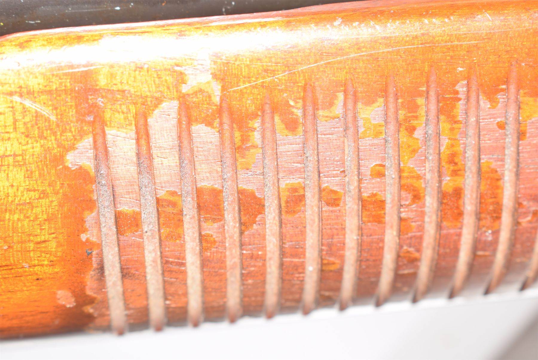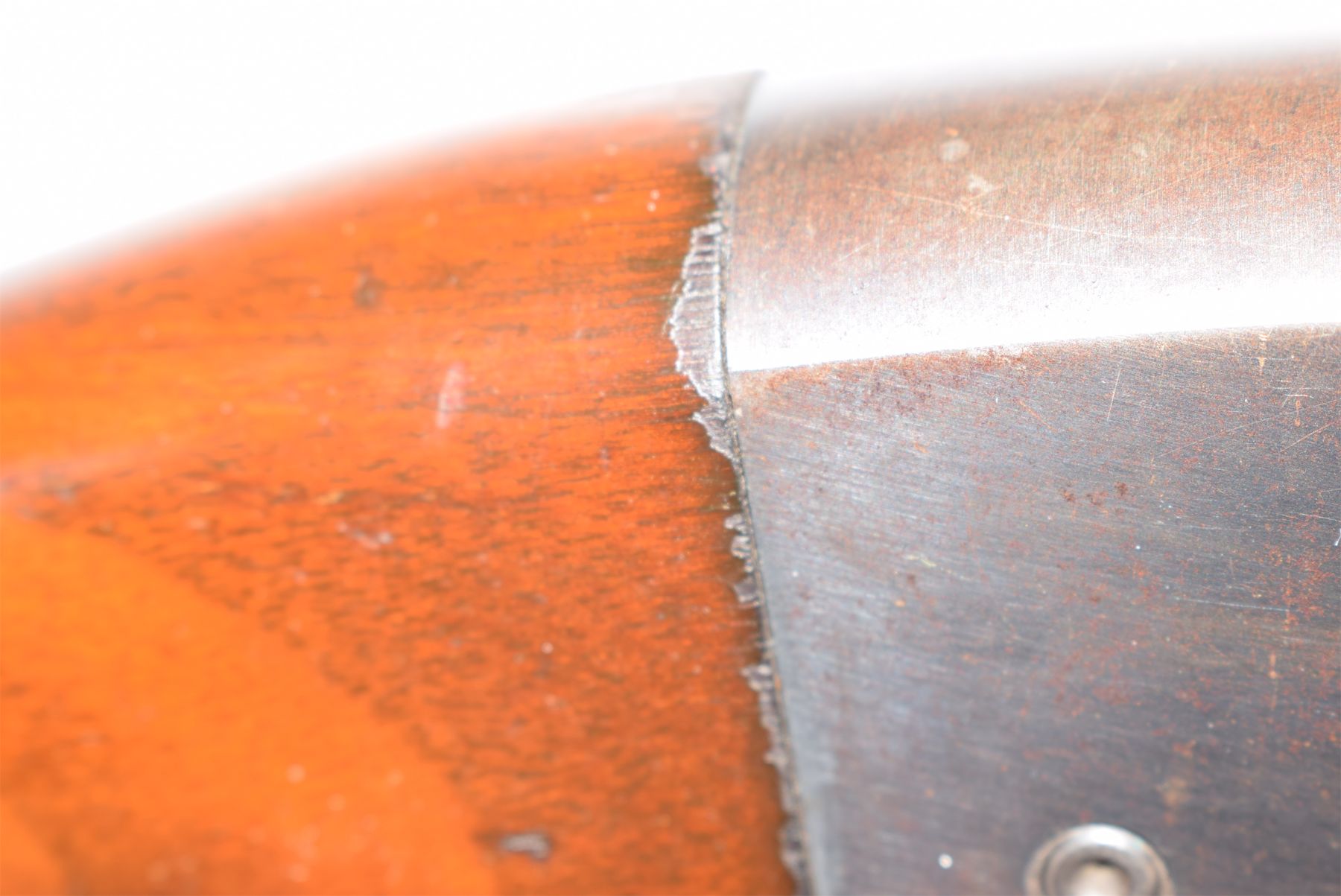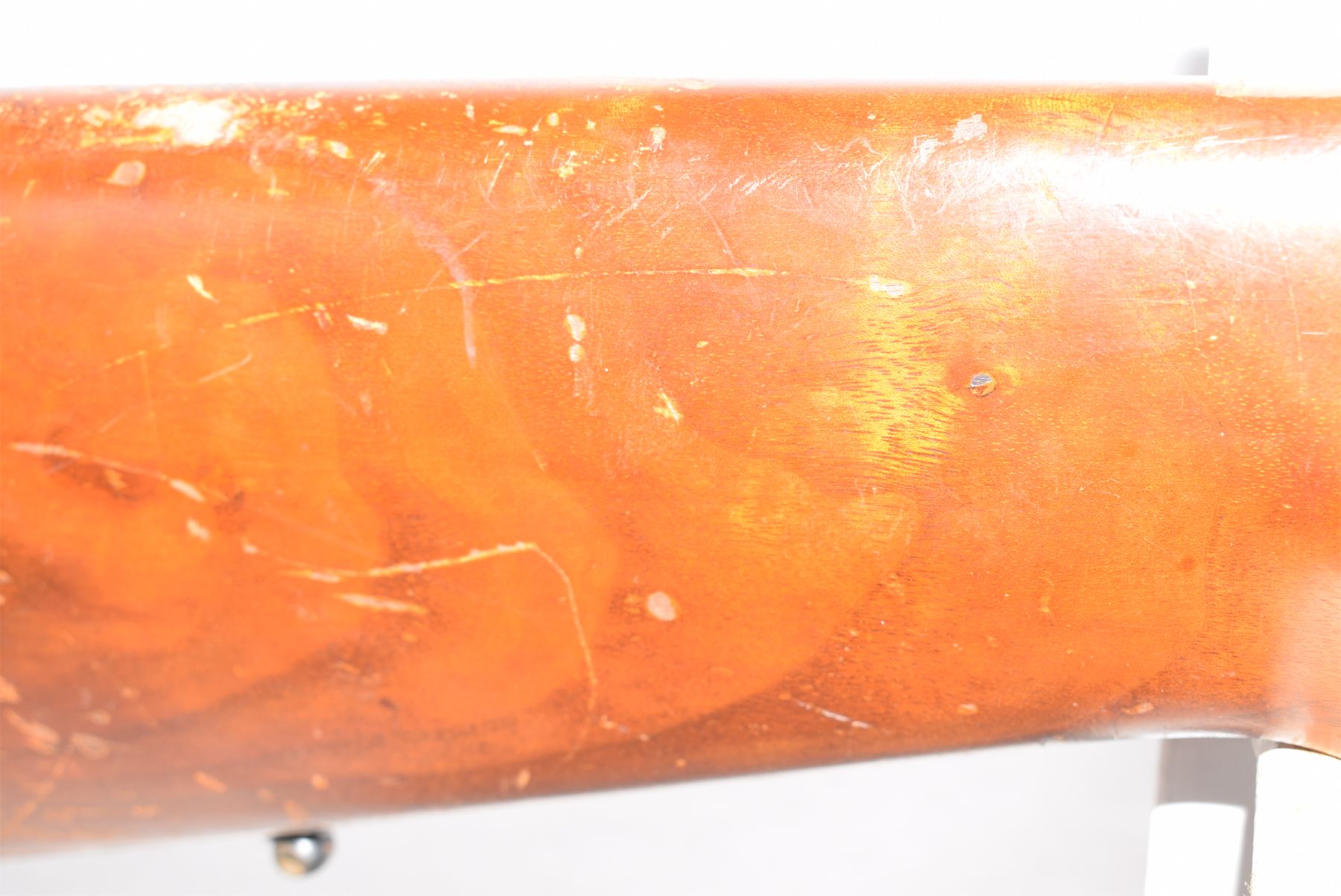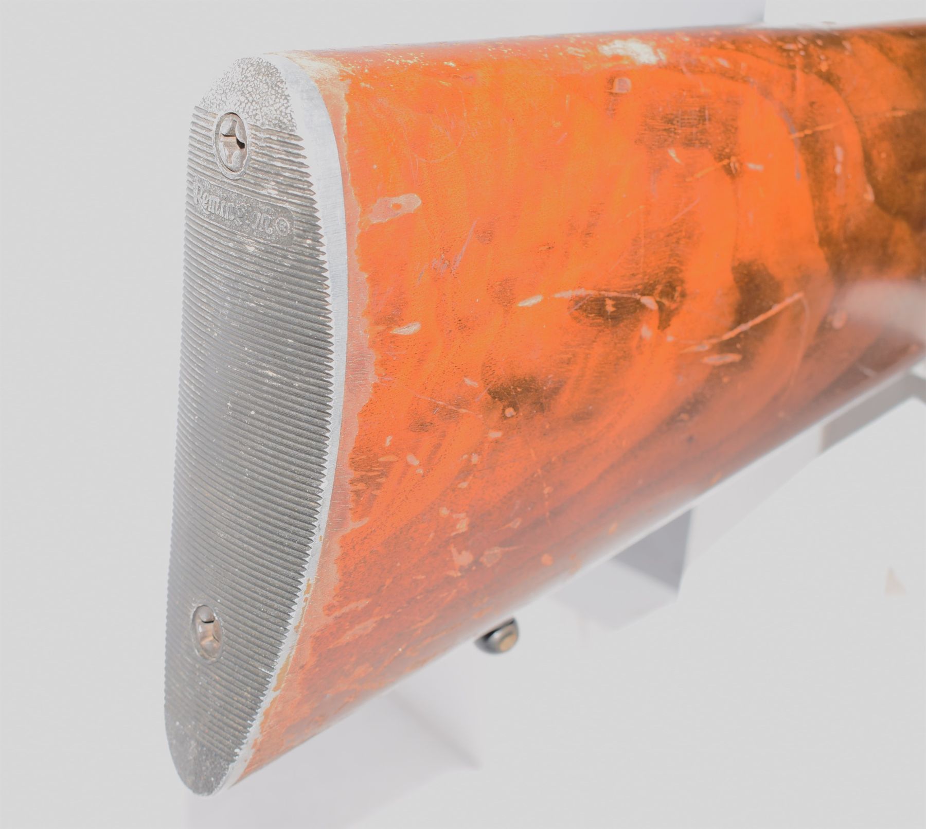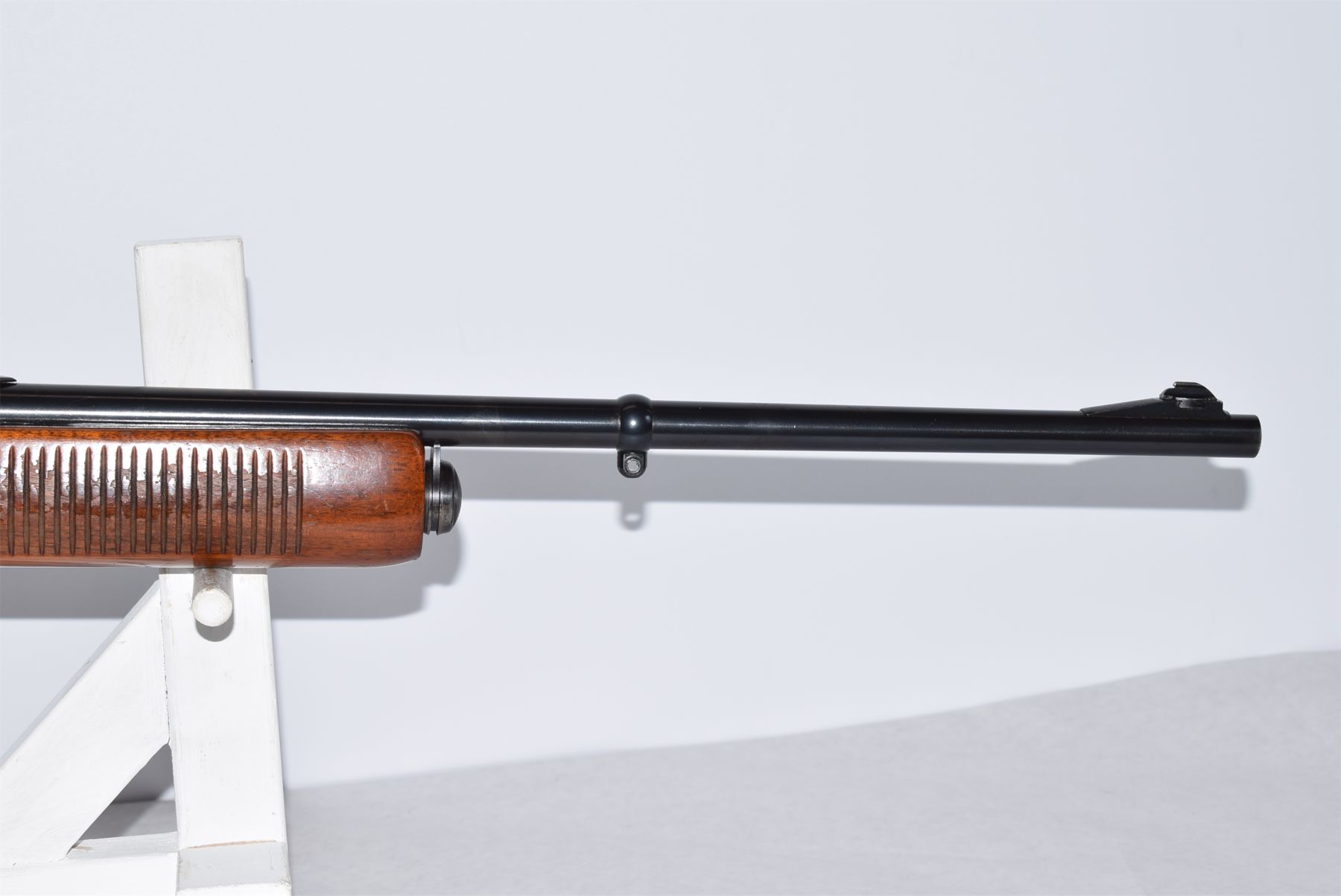 Wood has scratches, dents, scuffs, and lots of finish wear spots. Condition is fair. Bluing shows finish wear, scuffs, and light scratches. Condition is fair. Bore is excellent. Comes with Tasco Red Dot and an extra magazine.