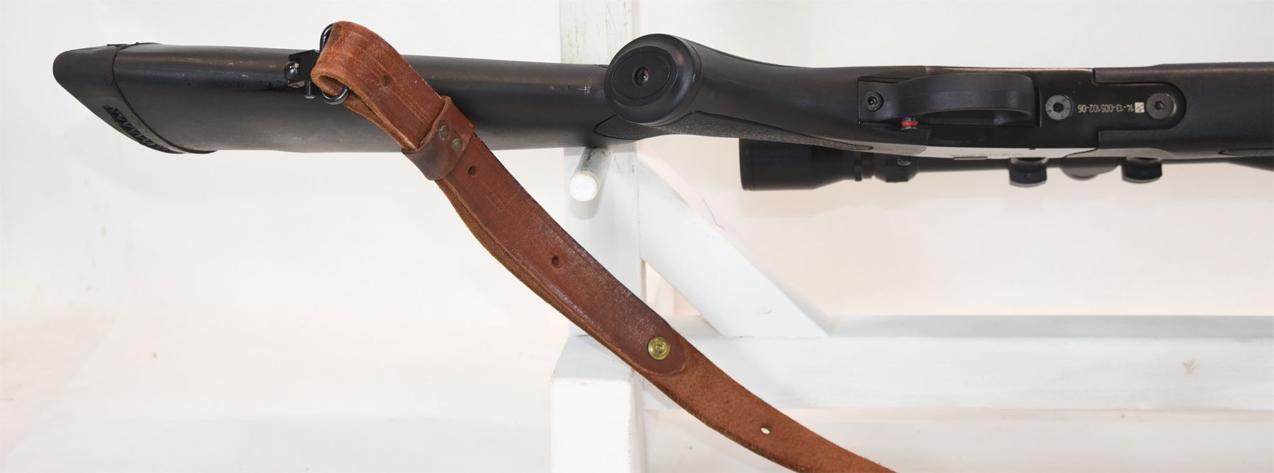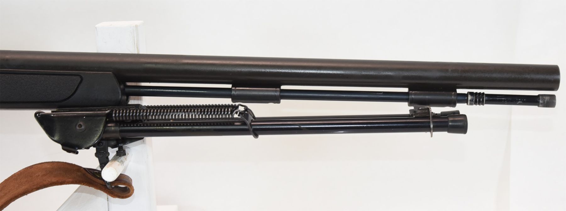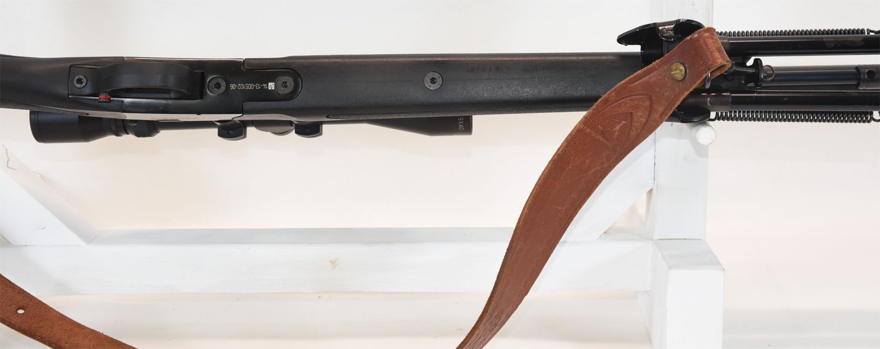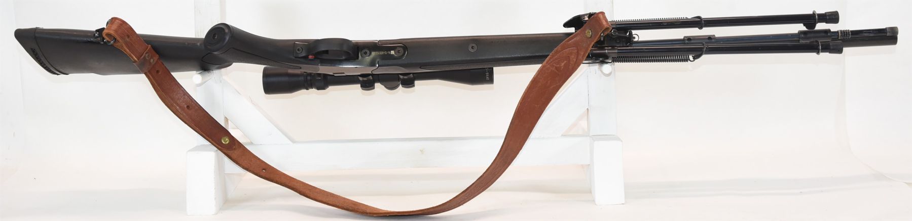Synthetic stock has scuffs, scratches, and handling marks throughout, but overall condition is very good. Bluing is slightly worn on the receiver with light scratches on the right side, scuffs, and other handling marks. Barrel finish is now dull grey with rust/corrosion spots throughout the length. Light scuffs and scratches are present from handling. Missing the front sight bead. Push rod has handling and use marks. Bore condition is unknown. Comes with Harris bi-pod and leather sling attached.