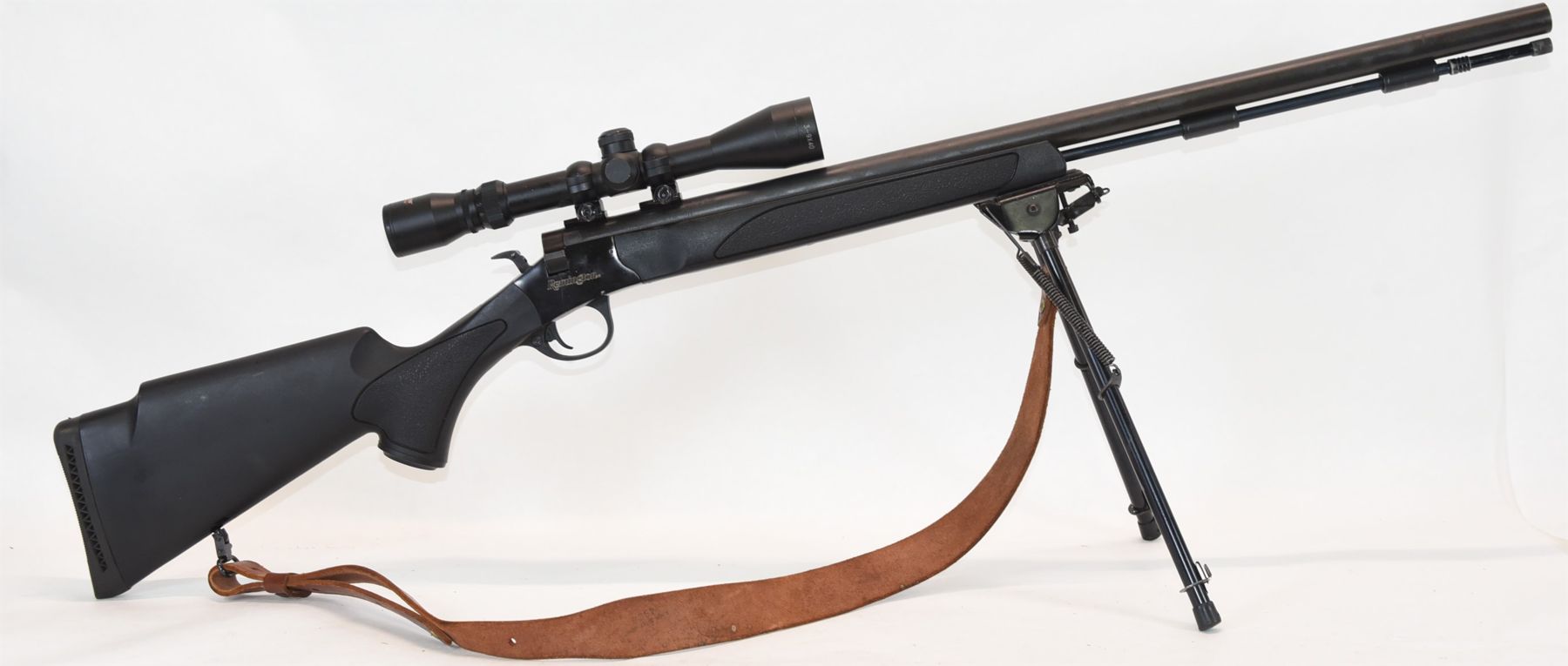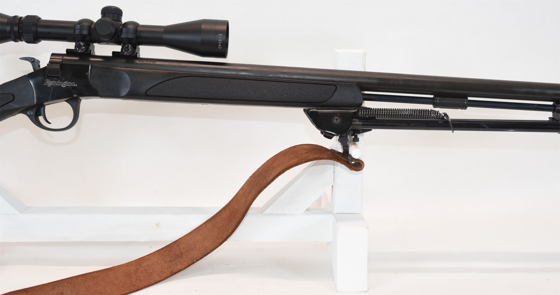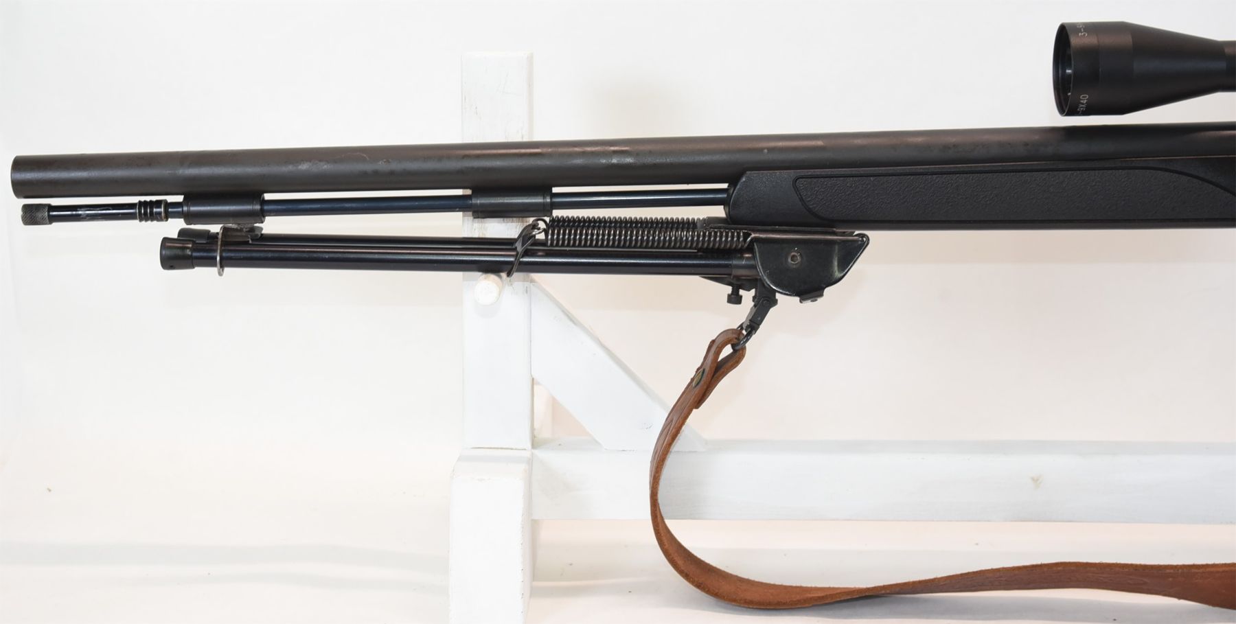 Synthetic stock has scuffs, scratches, and handling marks throughout, but overall condition is very good. Bluing is slightly worn on the receiver with light scratches on the right side, scuffs, and other handling marks. Barrel finish is now dull grey with rust/corrosion spots throughout the length. Light scuffs and scratches are present from handling. Missing the front sight bead. Push rod has handling and use marks. Bore condition is unknown. Comes with Harris bi-pod and leather sling attached.