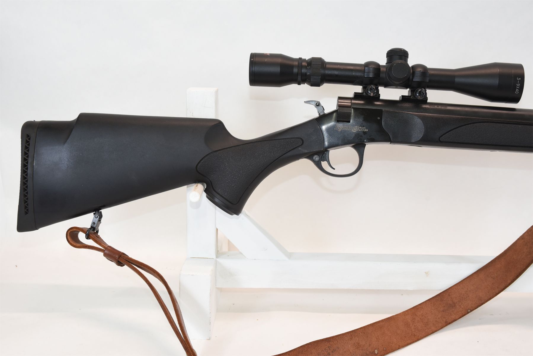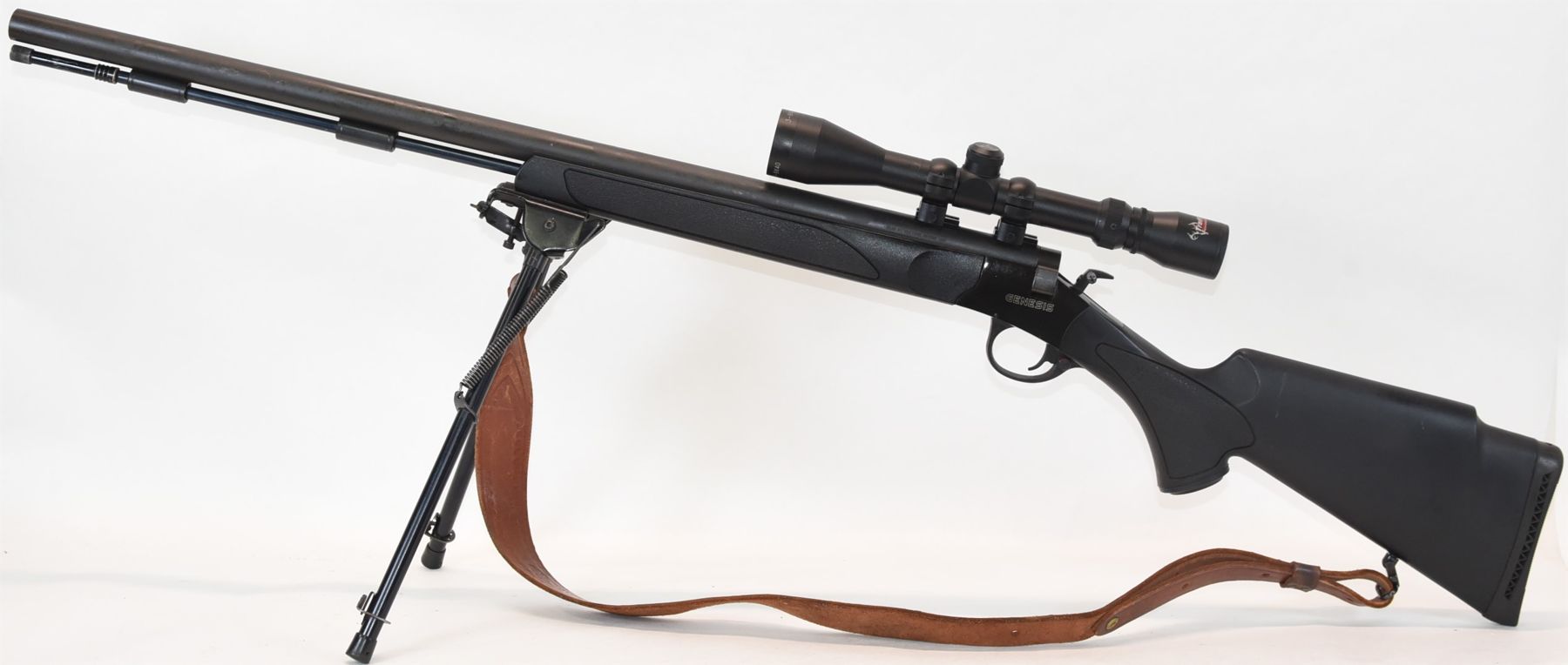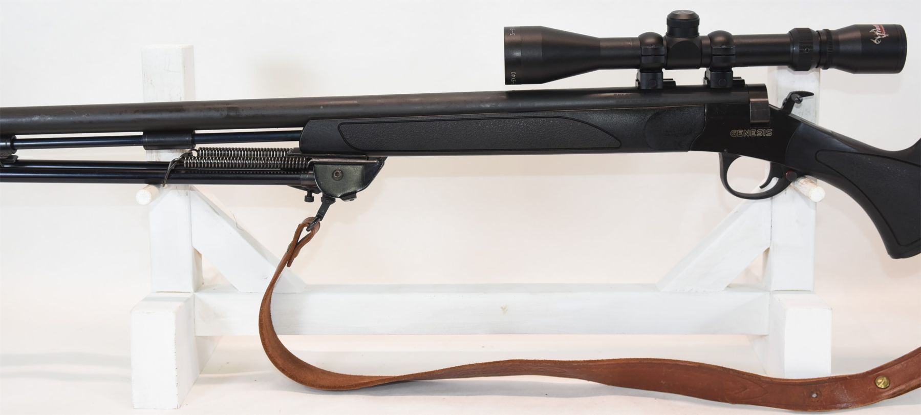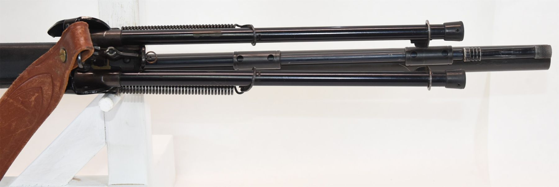 Synthetic stock has scuffs, scratches, and handling marks throughout, but overall condition is very good. Bluing is slightly worn on the receiver with light scratches on the right side, scuffs, and other handling marks. Barrel finish is now dull grey with rust/corrosion spots throughout the length. Light scuffs and scratches are present from handling. Missing the front sight bead. Push rod has handling and use marks. Bore condition is unknown. Comes with Harris bi-pod and leather sling attached.