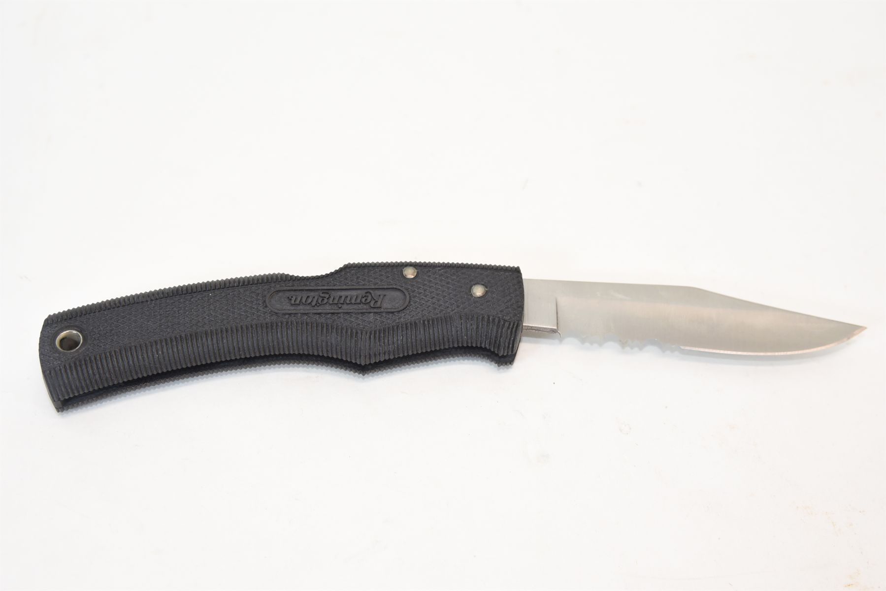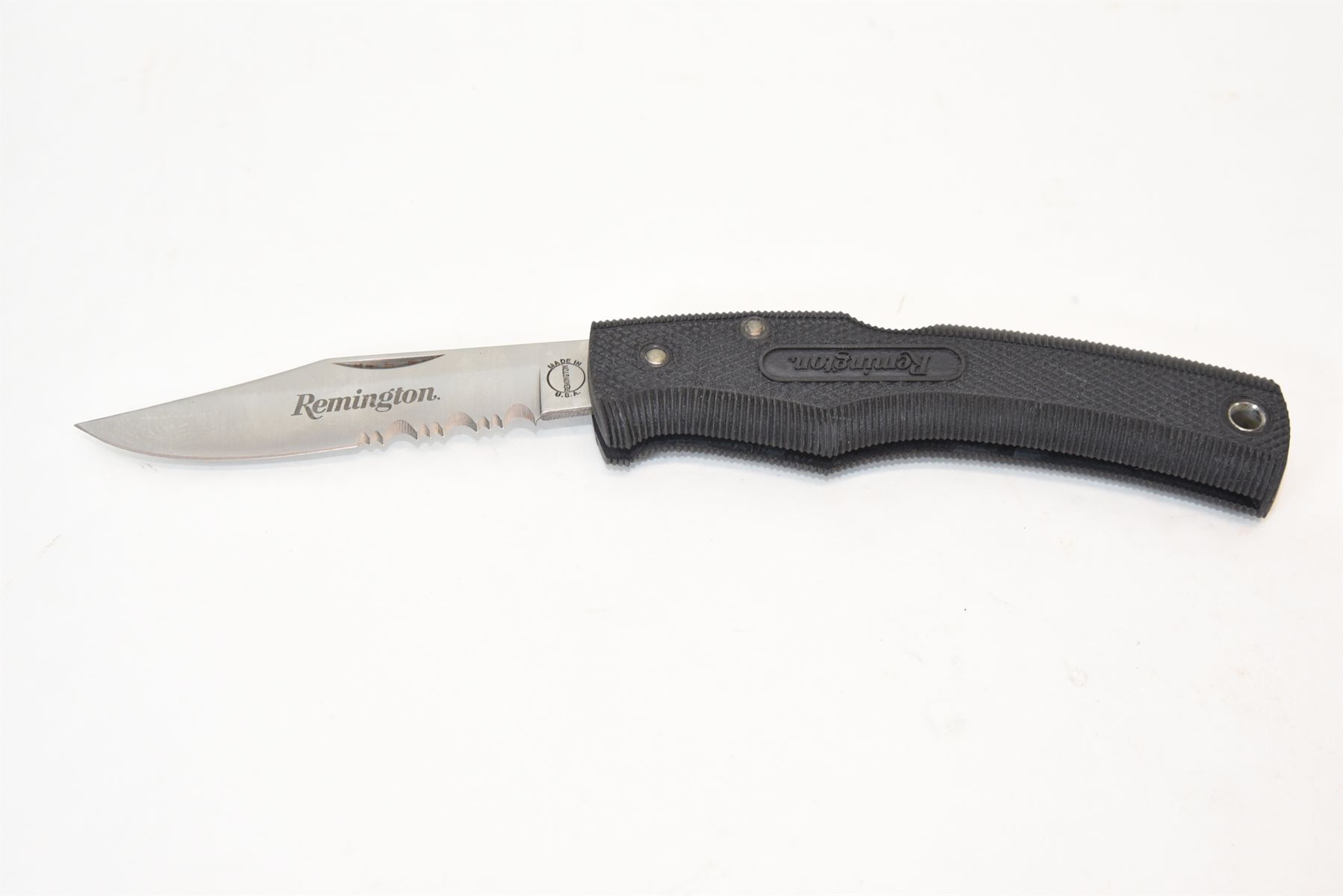 5" closed and 8.5" opened. Made in USA stamped on tang of blade. Comes with Remington Cordura sheath.