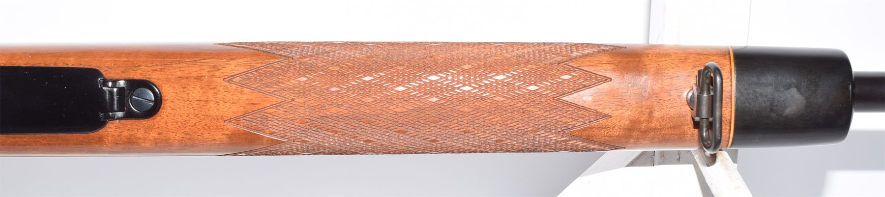 Wood shows lots of dents in the stock on the left side - possibly dropped on a rough surface. There are scratches, scuffs, and light finish wear. Bluing shows a few dent marks on the receiver. Aside from that, there are light scratches, scuffs, and finish wear. Bore is in excellent condition. Has swivel mounts. Overall condition of rifle is very good.