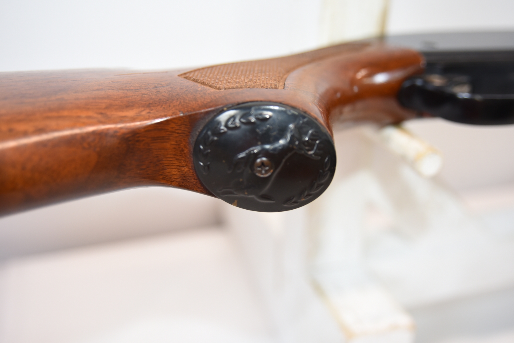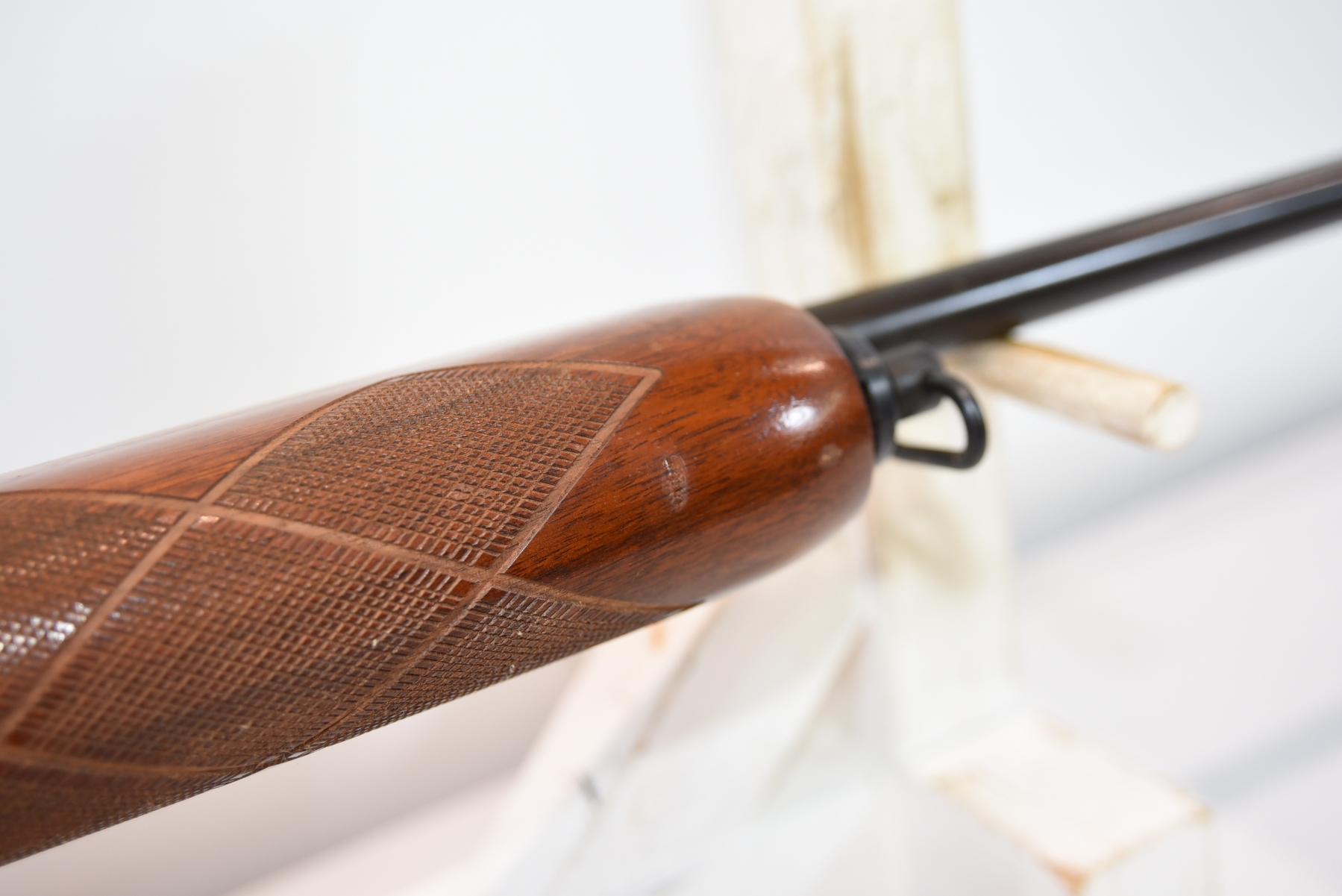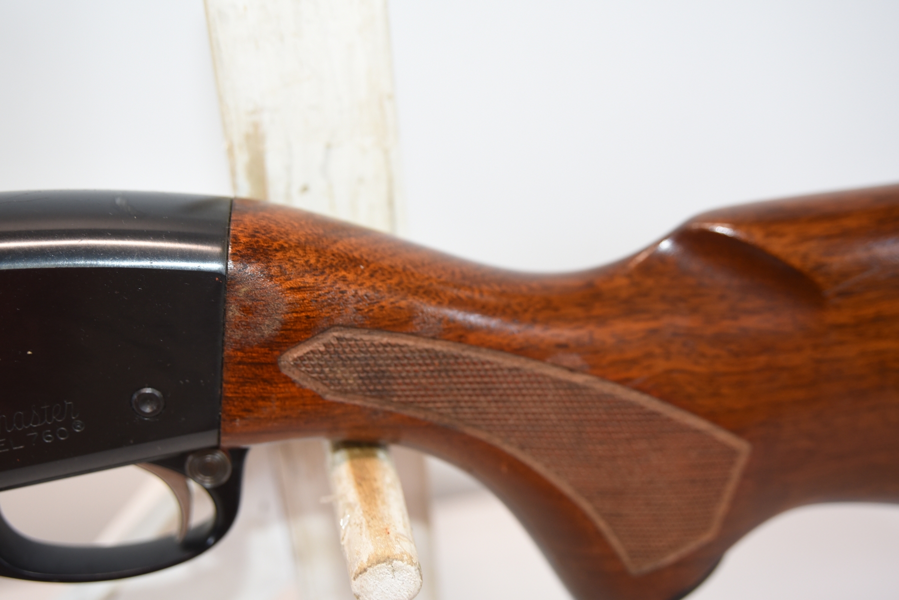 Wood stock shows adhesive residue on the left side of forearm, scratches, scuffs, few dents; condition is good.