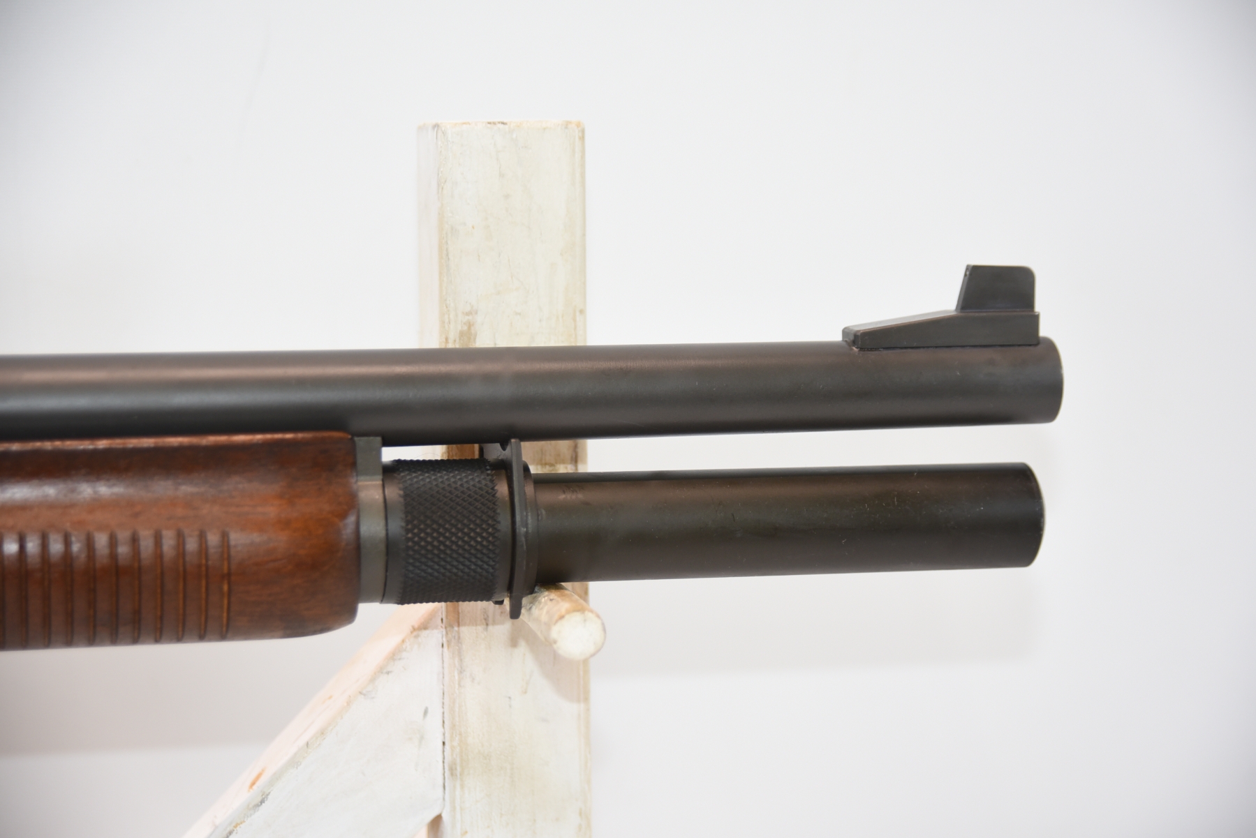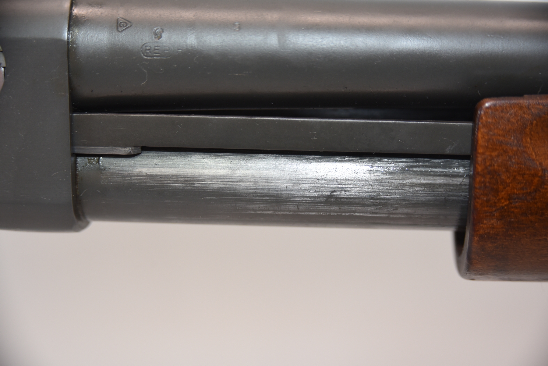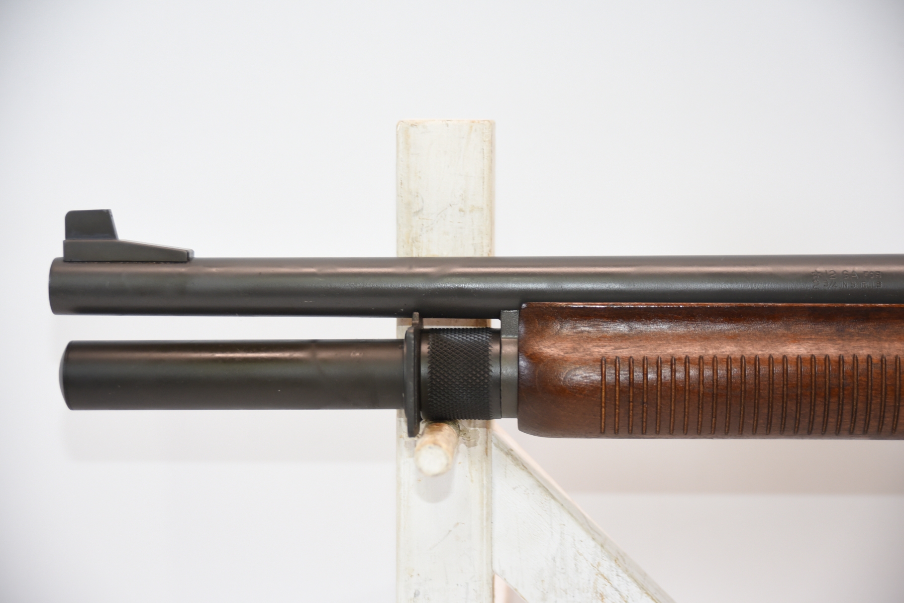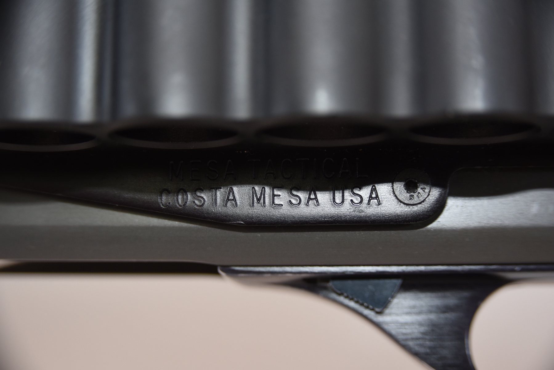 The wooden stock has several scratches and minor dents on both sides. There are wood chips on both sides near the grips. There are white scuff marks on the left hand side. There is a crack on the left hand side where the wooden stock meets the receiver on the bottom side. The matte receiver has a number of scratches on the right hand side. The left hand side has a Mesa Tactical ammunition holder attached to hold an additional 6 rounds. The wooden forearm is in very good condition. The matte bore has a number of proof marks on both sides near where the more meets the receiver. There are a couple minor scratches on both sides of the barrel but overall in very good condition. There is typical wear from the forend sliding. The bore is shiny and smooth. Has cylinder choke. Has both rear and front sights.