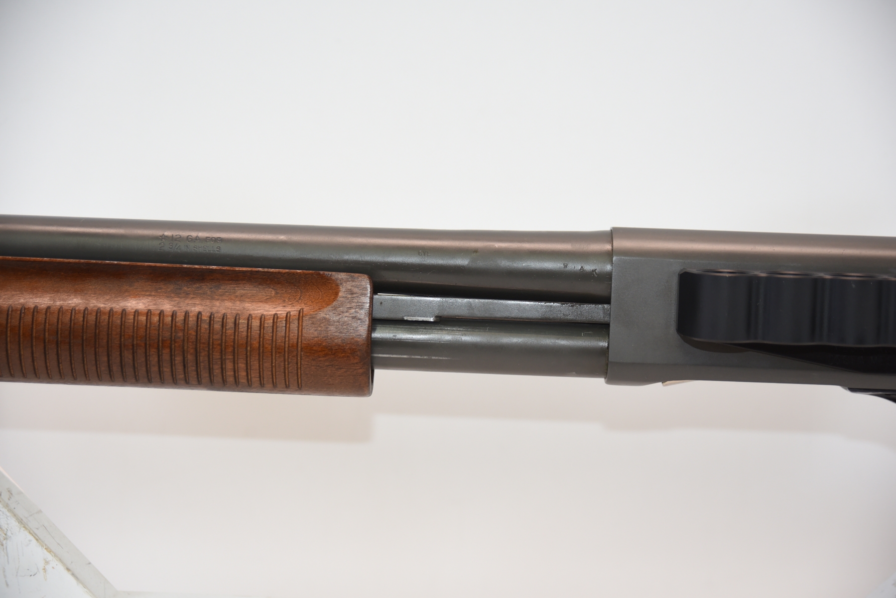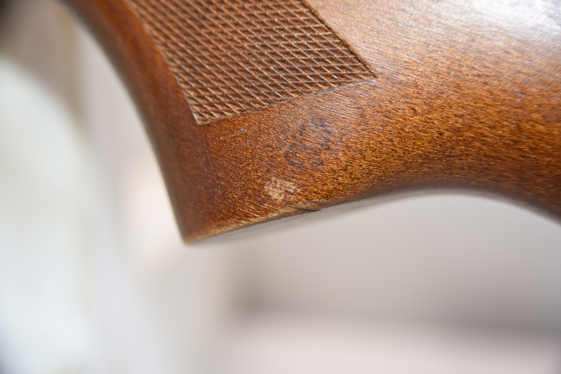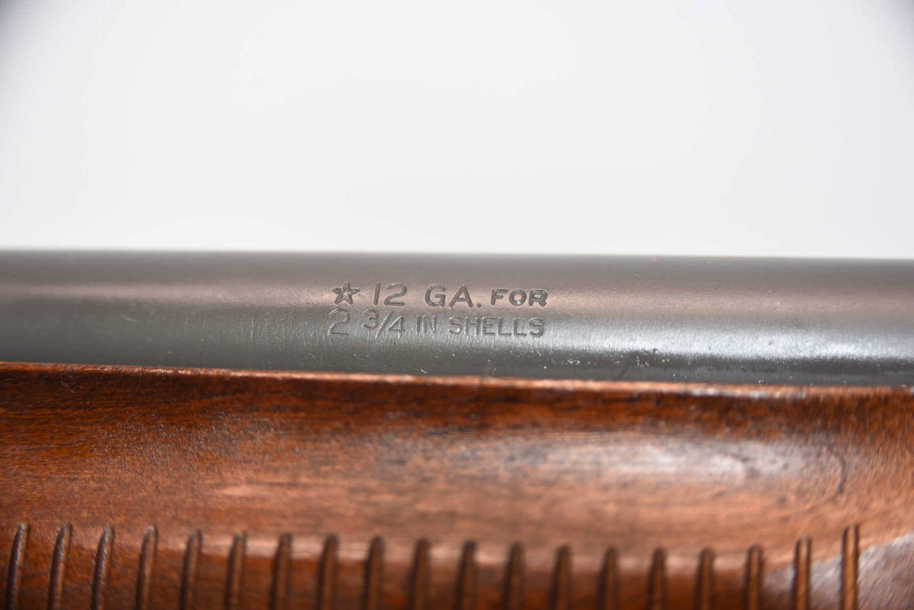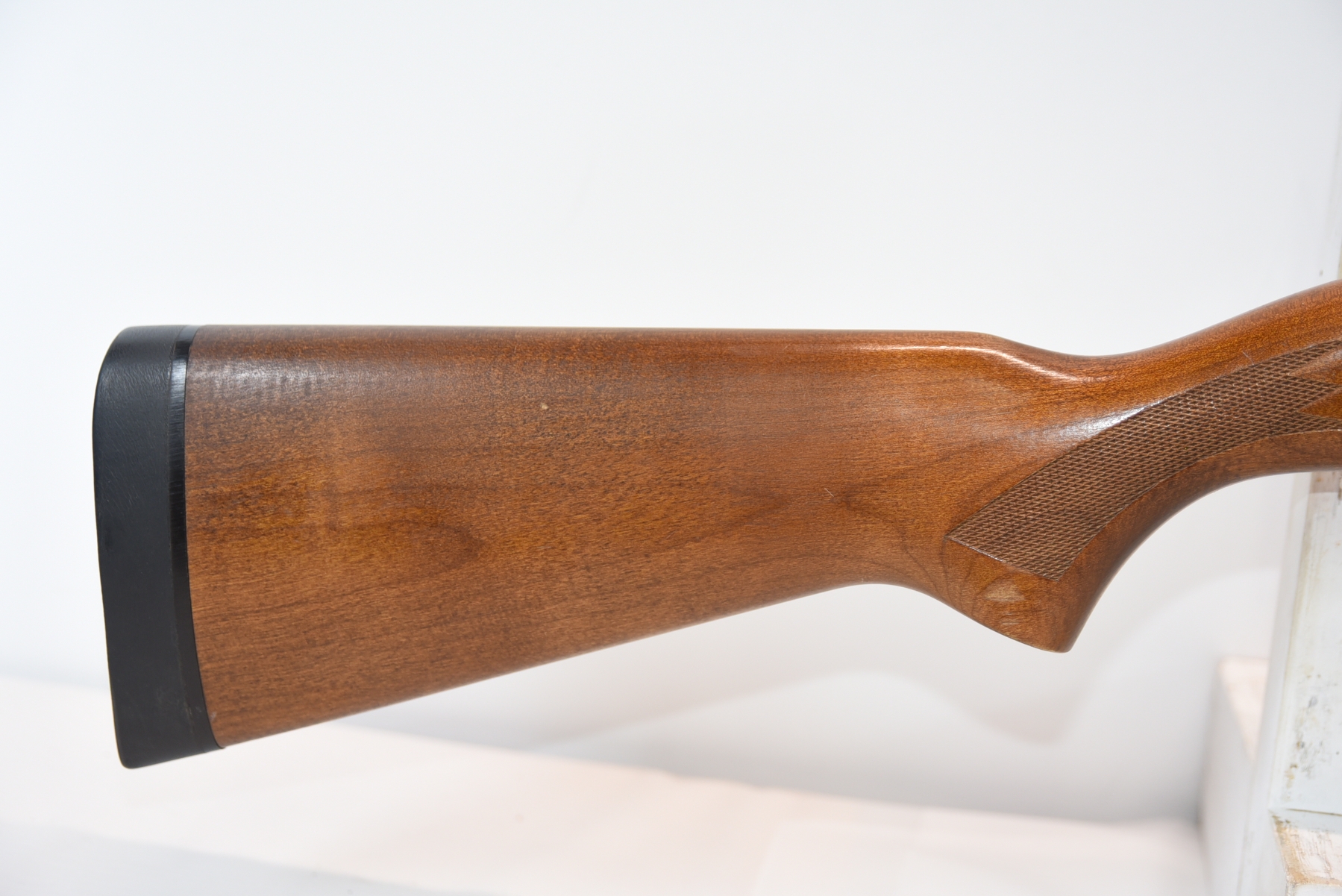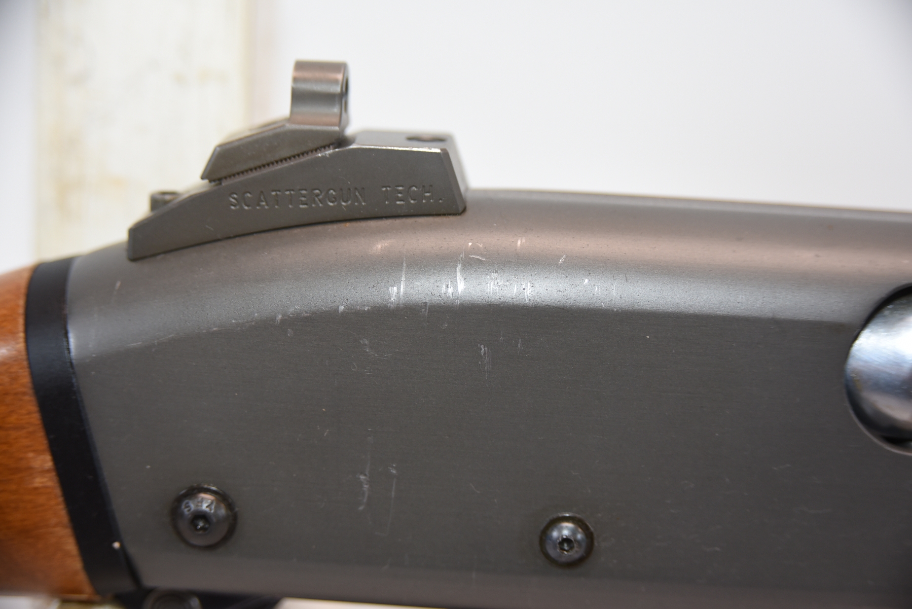 The wooden stock has several scratches and minor dents on both sides. There are wood chips on both sides near the grips. There are white scuff marks on the left hand side. There is a crack on the left hand side where the wooden stock meets the receiver on the bottom side. The matte receiver has a number of scratches on the right hand side. The left hand side has a Mesa Tactical ammunition holder attached to hold an additional 6 rounds. The wooden forearm is in very good condition. The matte bore has a number of proof marks on both sides near where the more meets the receiver. There are a couple minor scratches on both sides of the barrel but overall in very good condition. There is typical wear from the forend sliding. The bore is shiny and smooth. Has cylinder choke. Has both rear and front sights.