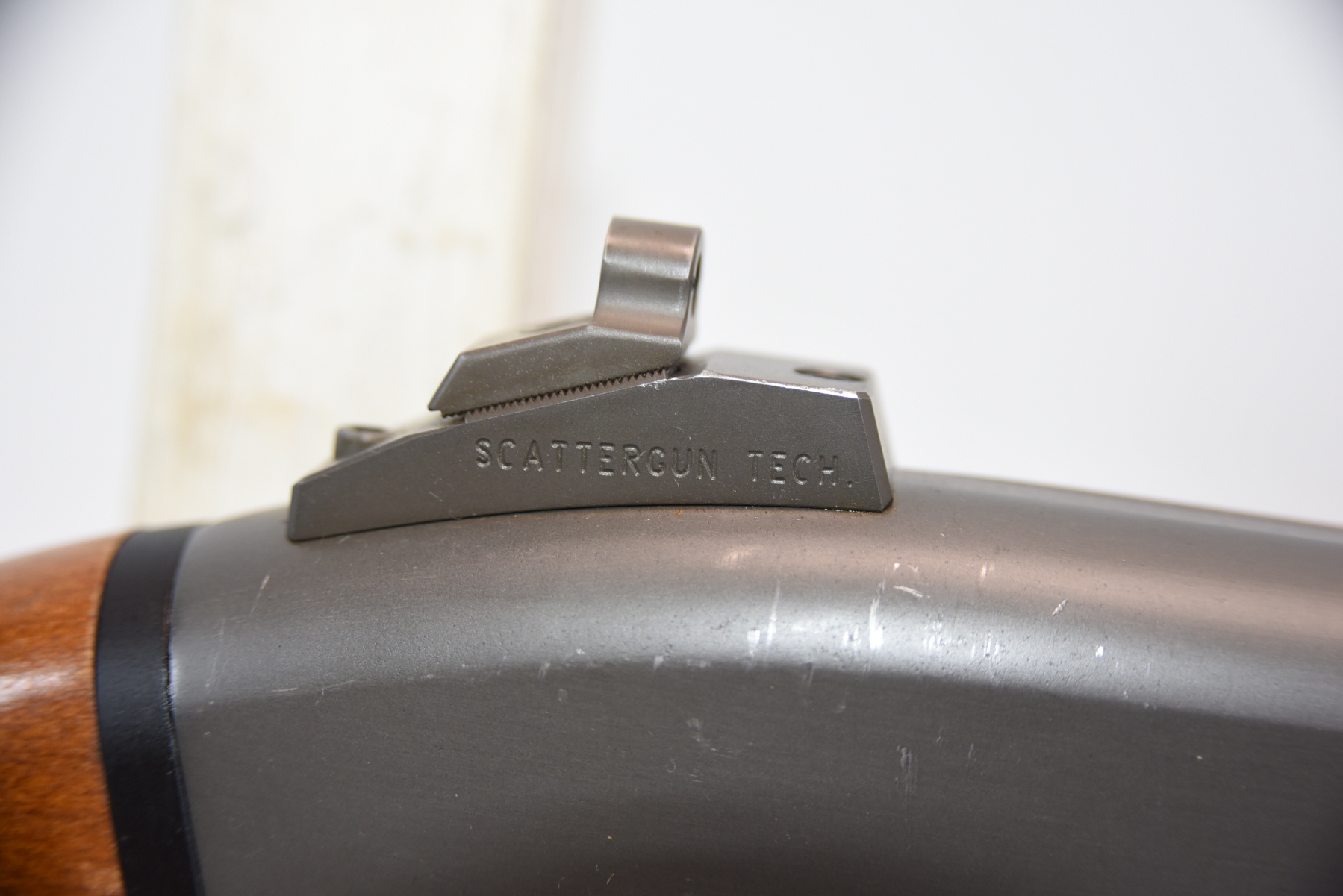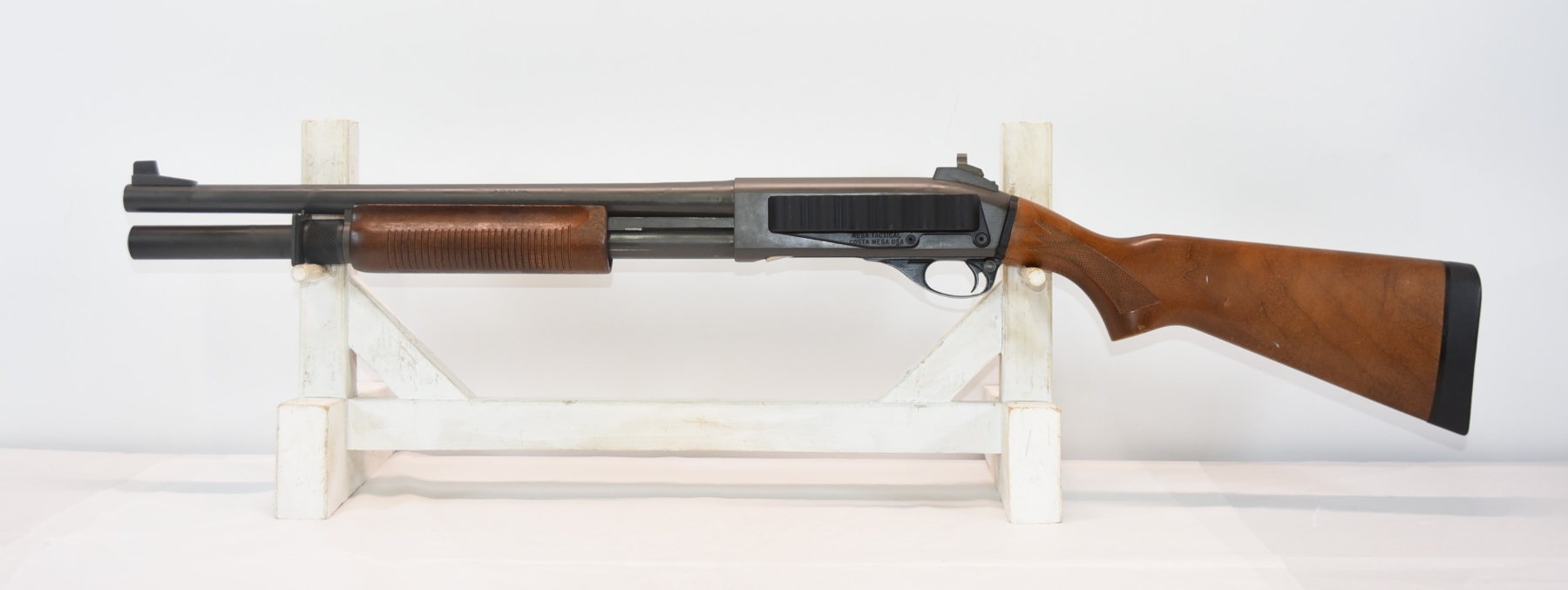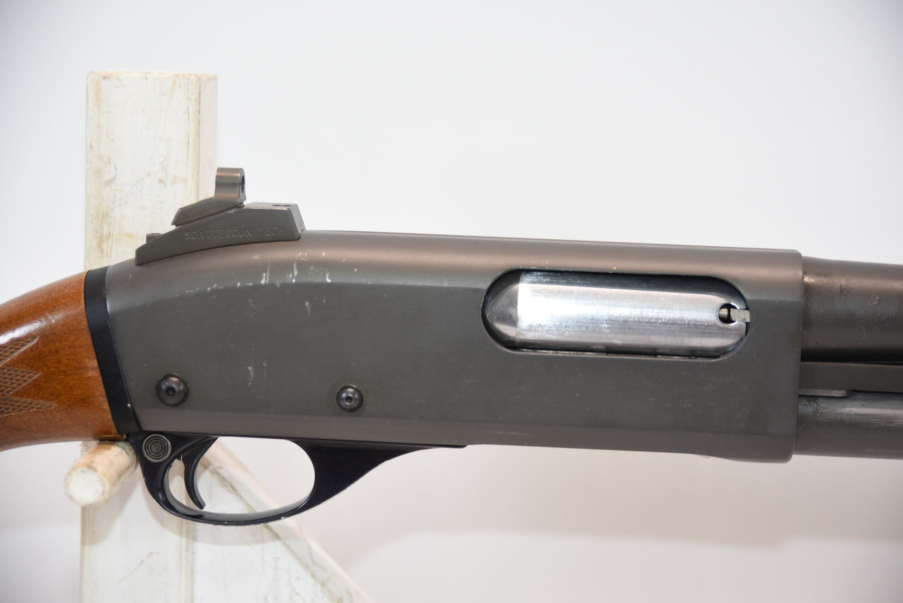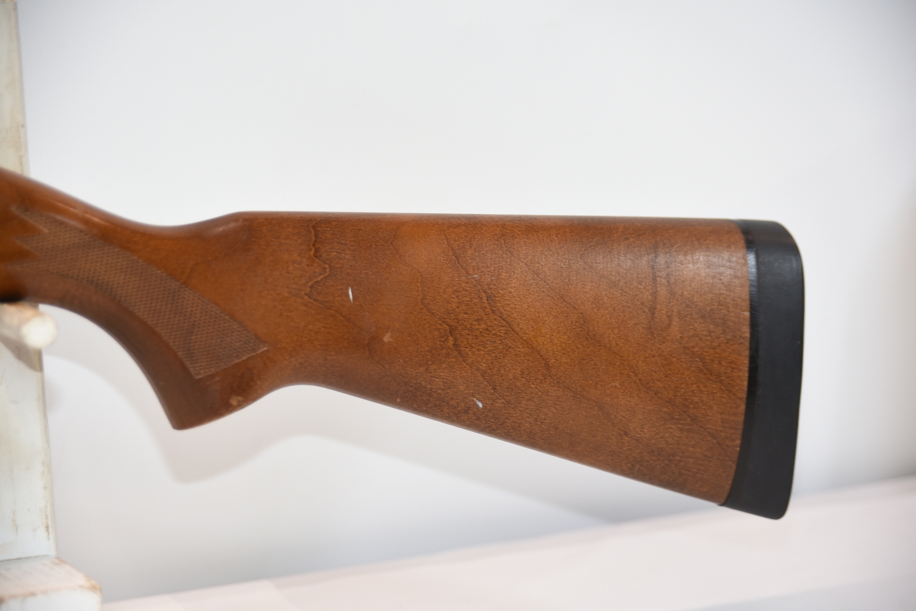 The wooden stock has several scratches and minor dents on both sides. There are wood chips on both sides near the grips. There are white scuff marks on the left hand side. There is a crack on the left hand side where the wooden stock meets the receiver on the bottom side. The matte receiver has a number of scratches on the right hand side. The left hand side has a Mesa Tactical ammunition holder attached to hold an additional 6 rounds. The wooden forearm is in very good condition. The matte bore has a number of proof marks on both sides near where the more meets the receiver. There are a couple minor scratches on both sides of the barrel but overall in very good condition. There is typical wear from the forend sliding. The bore is shiny and smooth. Has cylinder choke. Has both rear and front sights.