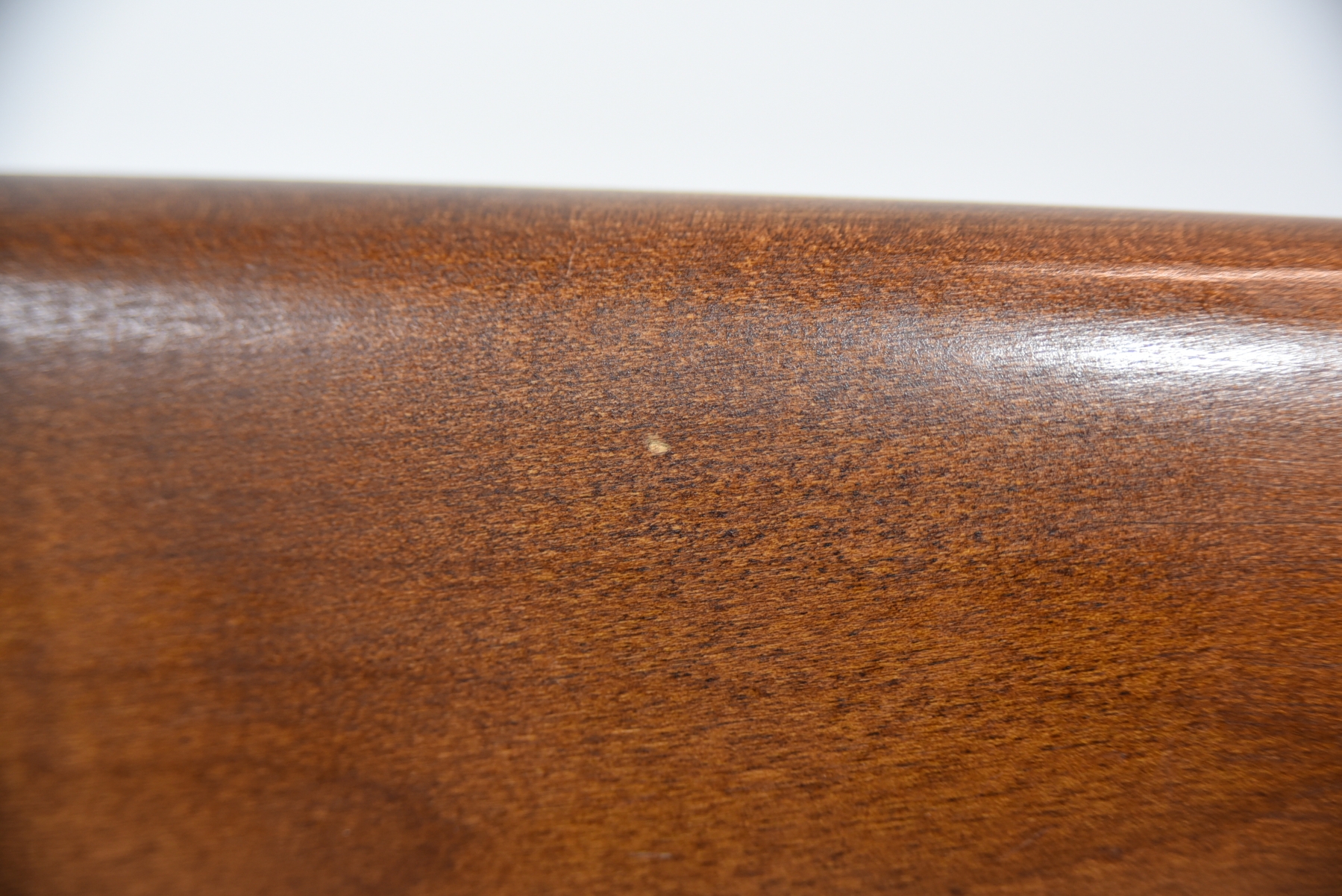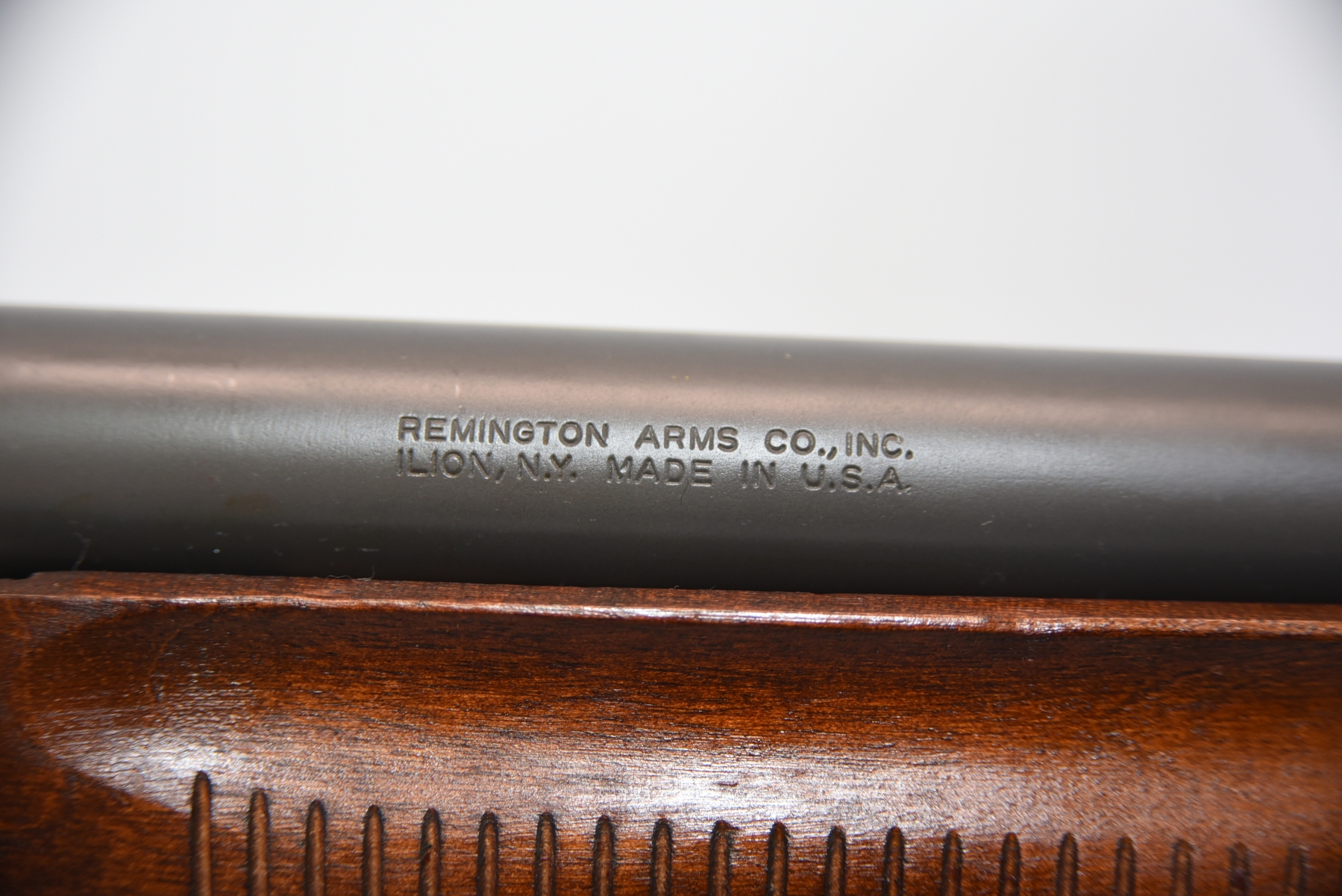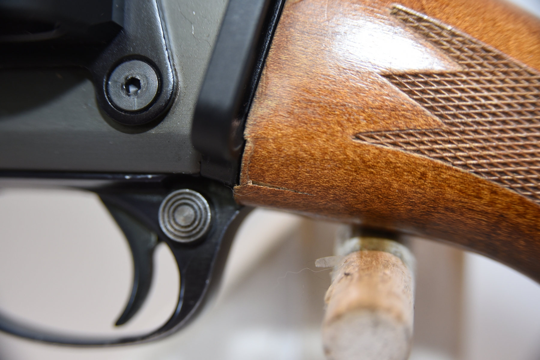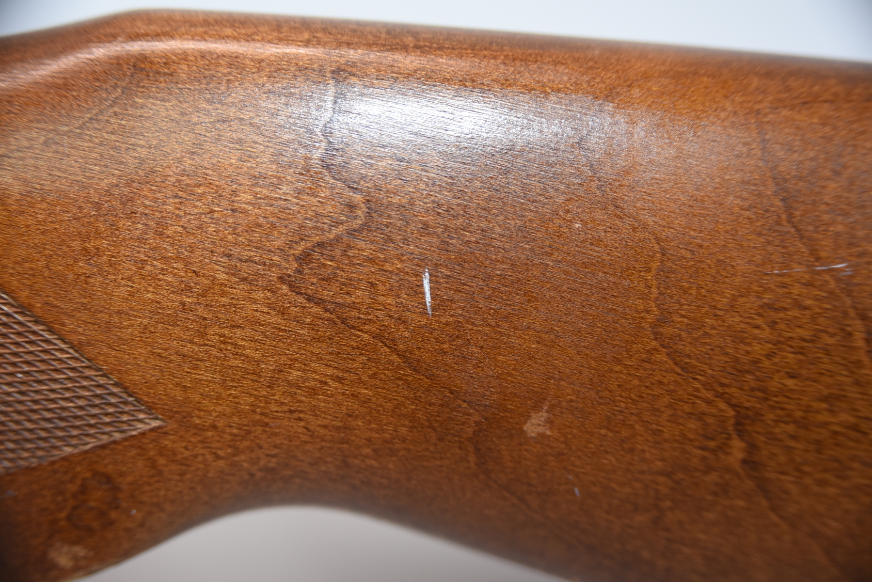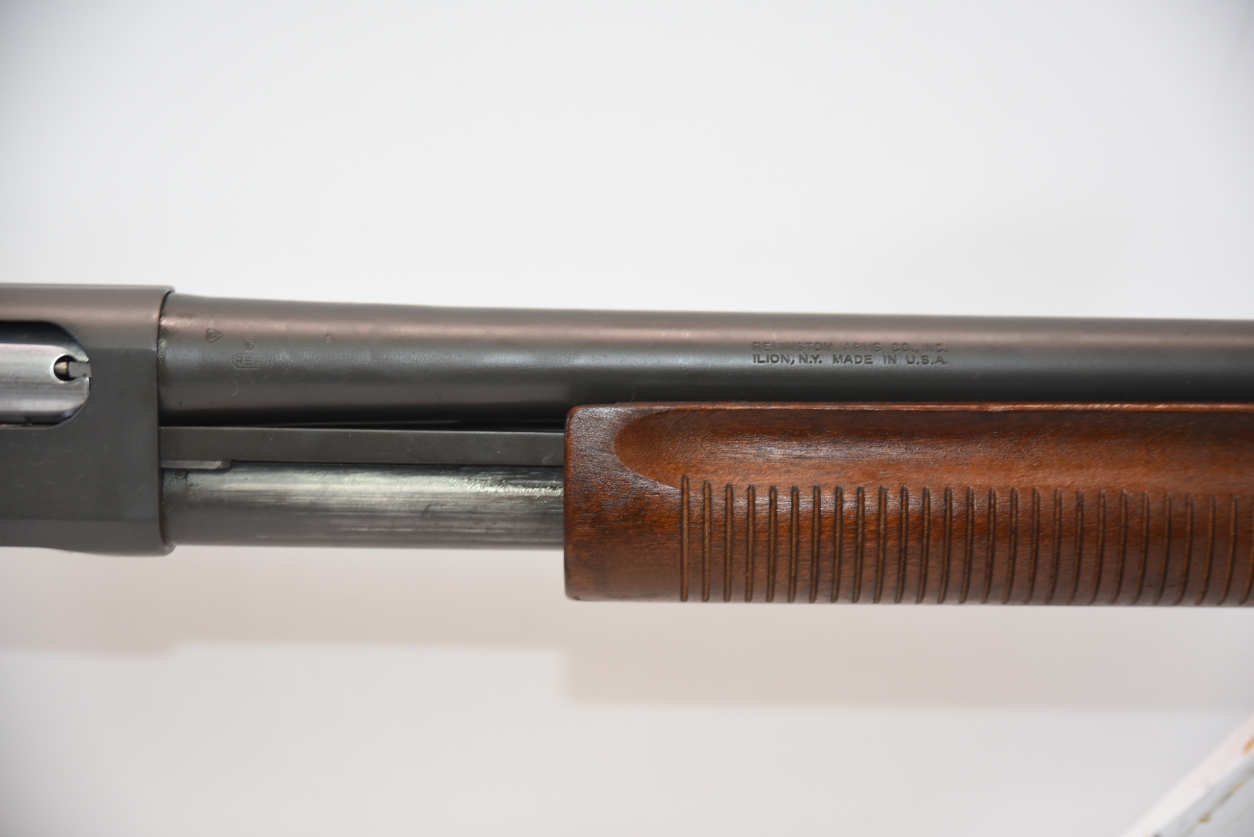 The wooden stock has several scratches and minor dents on both sides. There are wood chips on both sides near the grips. There are white scuff marks on the left hand side. There is a crack on the left hand side where the wooden stock meets the receiver on the bottom side. The matte receiver has a number of scratches on the right hand side. The left hand side has a Mesa Tactical ammunition holder attached to hold an additional 6 rounds. The wooden forearm is in very good condition. The matte bore has a number of proof marks on both sides near where the more meets the receiver. There are a couple minor scratches on both sides of the barrel but overall in very good condition. There is typical wear from the forend sliding. The bore is shiny and smooth. Has cylinder choke. Has both rear and front sights.