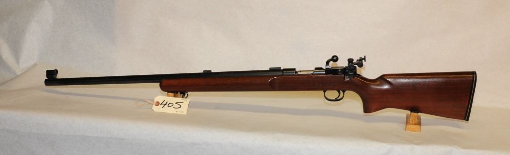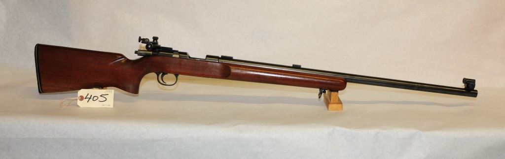 Non-restricted, single shot, 22LR, 28" target barrel, SN 09830. Wood has some handling marks, bluing is grey, bore excellent. Redfield Olympic target sights. Solid block mag.