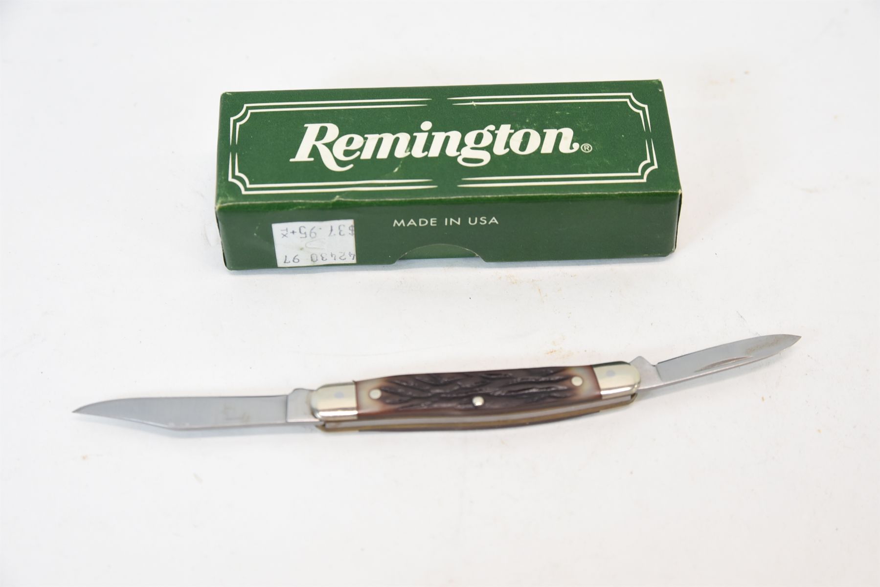 Remington. Made in USA is stamped in the tang. 2.75" closed. 6.25" fully opened.