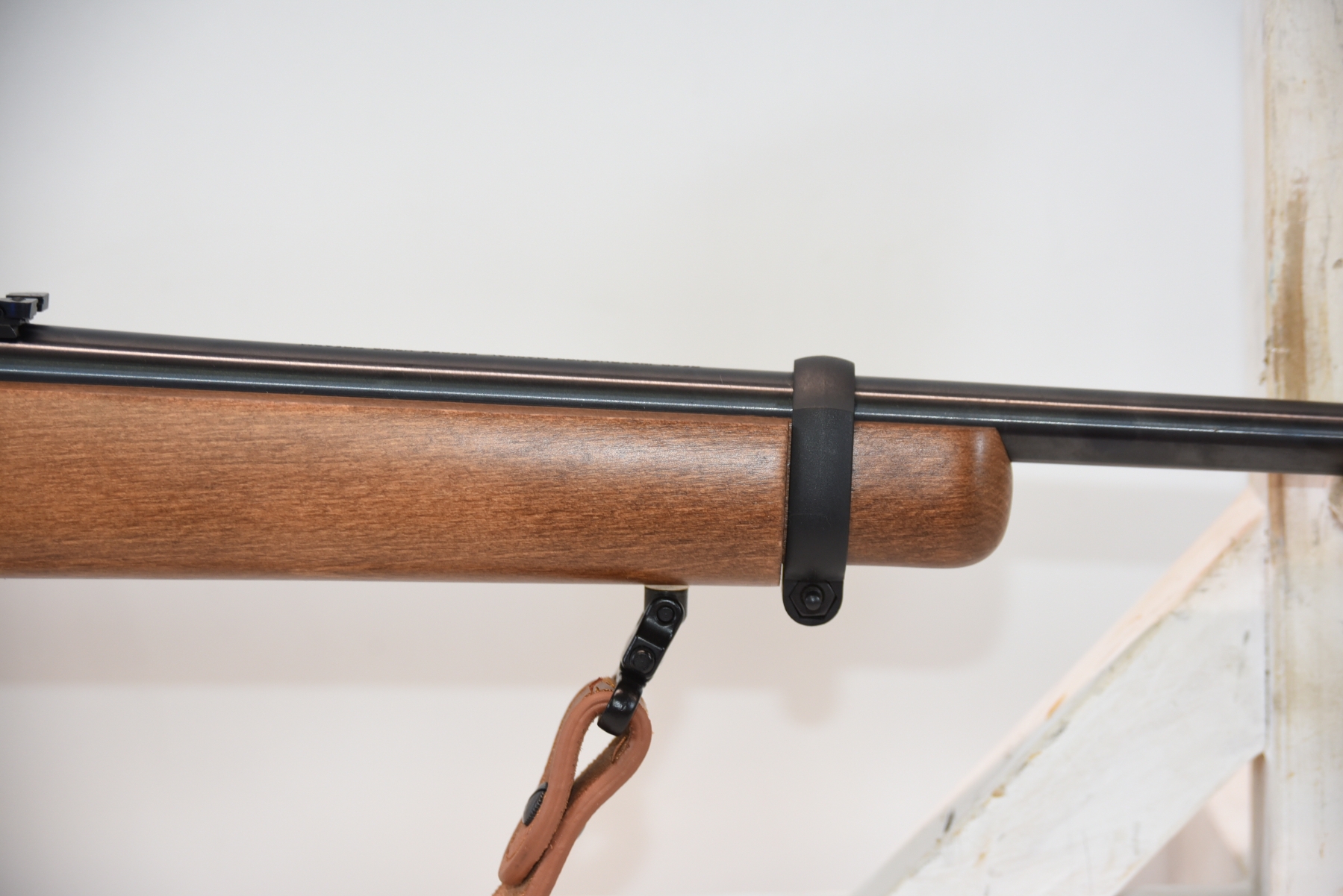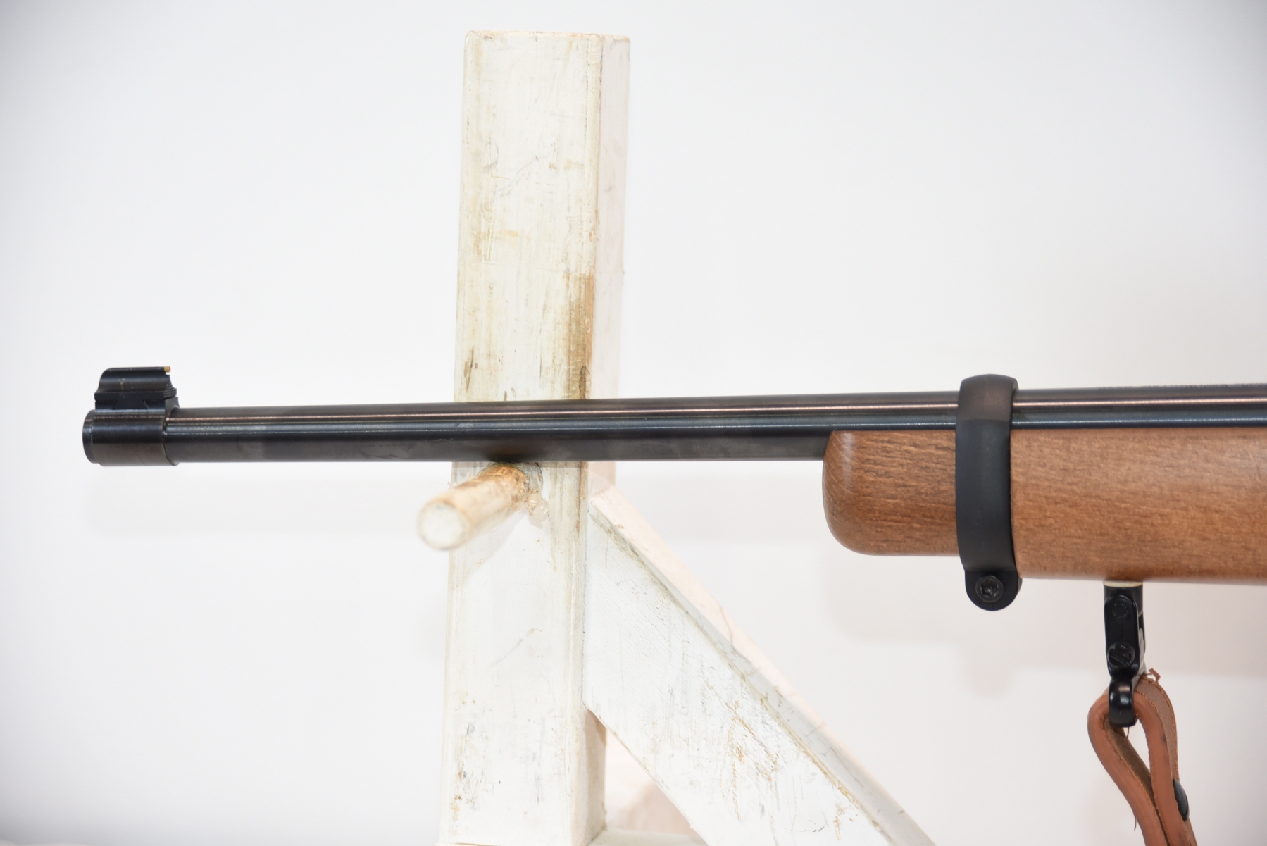 The wooden stock has some scratches on the right hand side. There is some scratches and dents on the bottom side. The wooden forearm has some light scratches and a few small dents on both sides. The shiny bluing has some light scratches. Has sights. The scope is in like new condition. The bore is shiny with apparent rifling, in excellent condition. Has a leather sling equipped.
