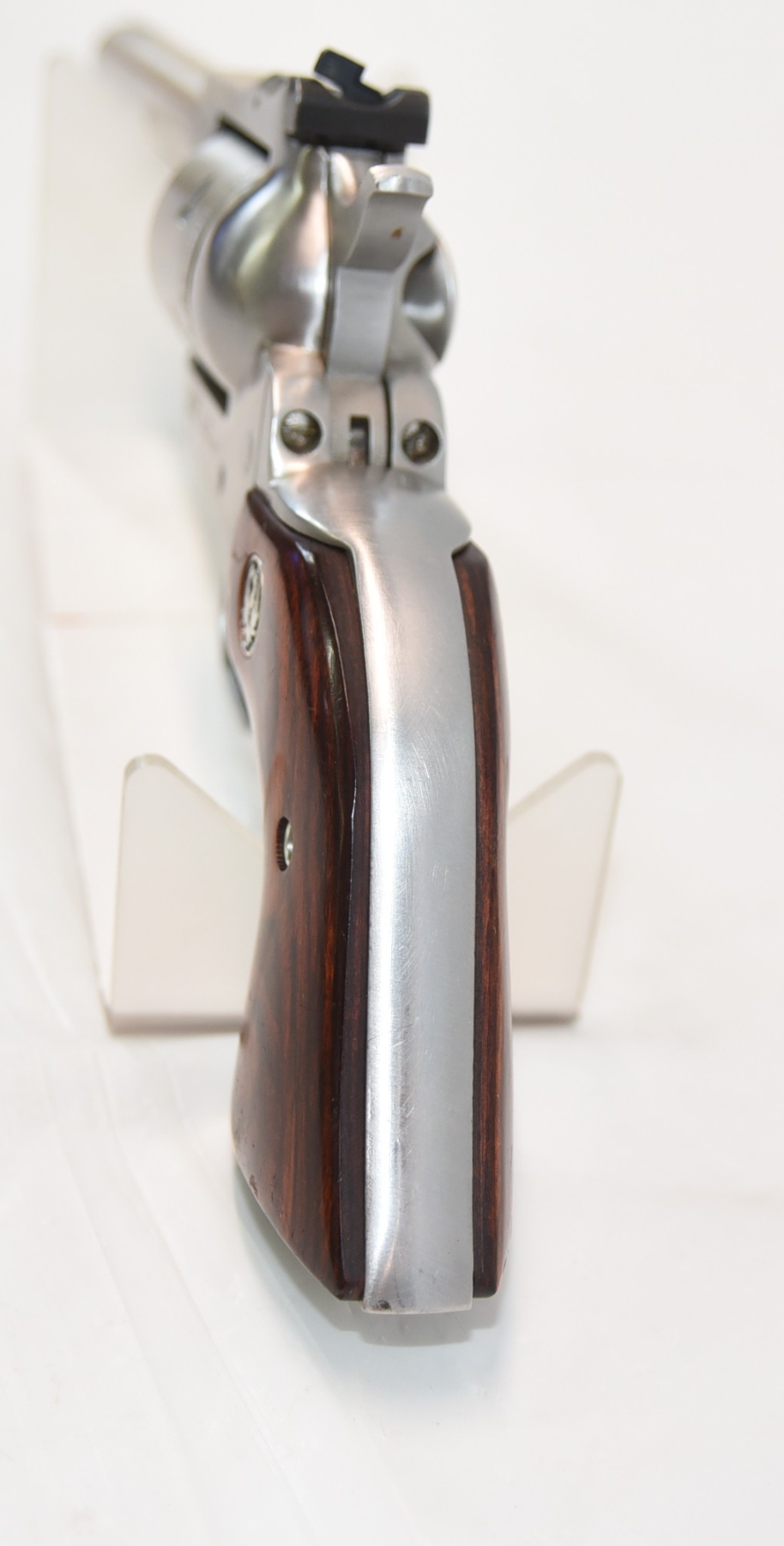 Wood grips show right panel has a piece missing, there are some scratches and scuffs; condition is fair.