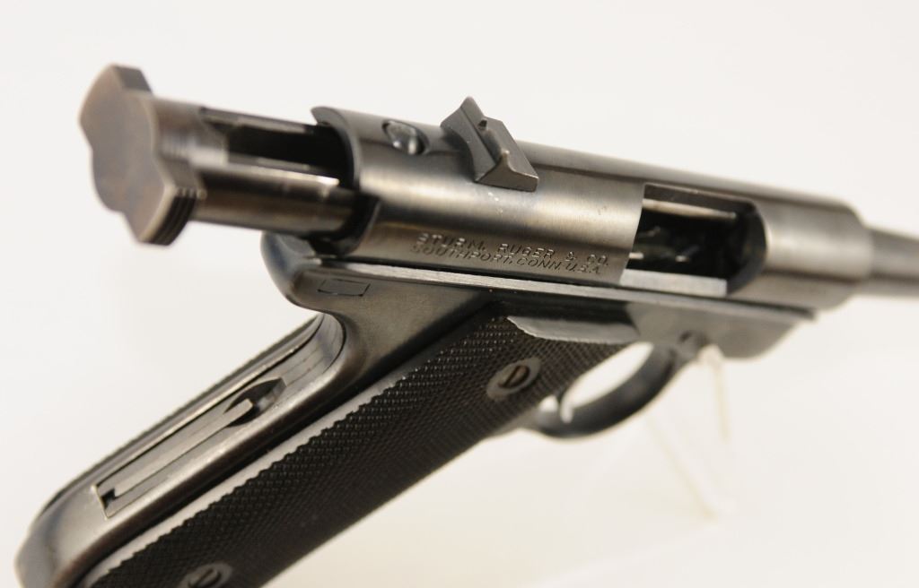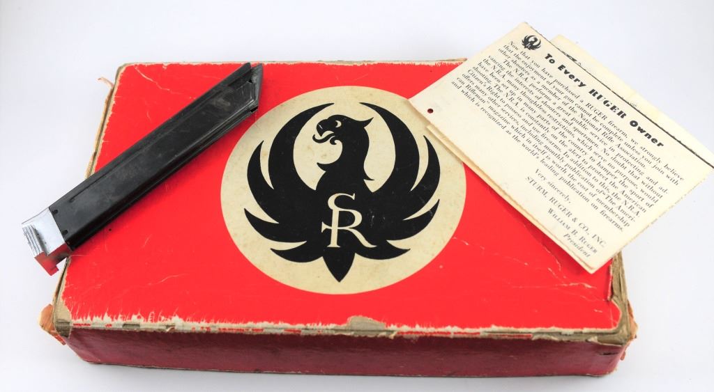 Restricted, semi auto, 22LR, 120mm barrel, SN 166983. Grips very good, bluing has wear, bore very good. Extra mag and original box.