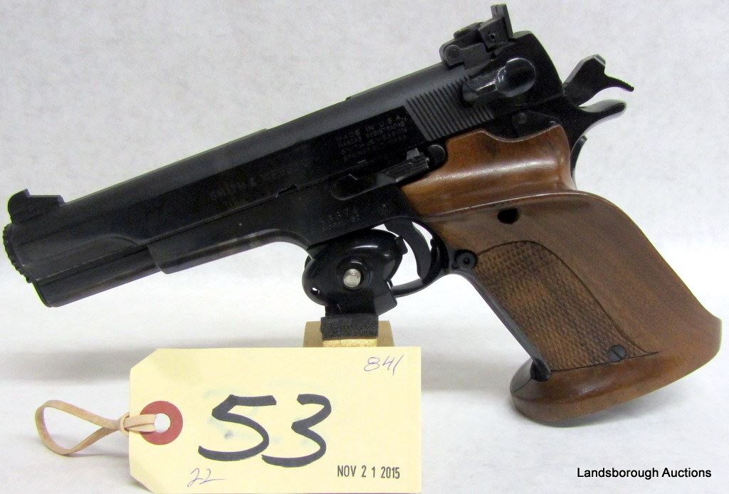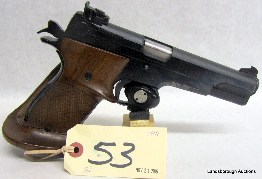 RESTRICTED, SEMI AUTO, 38 SPL MID-RANGE, 127MM BARREL, SN 53674. CUSTOM GRIPS HAVE A COUPLE DENTS, BLUING HAS SOME MARKS AHEAD OF TRIGGER GUARD, BORE VERY GOOD.