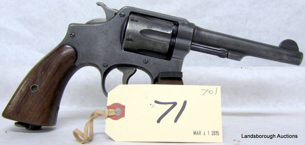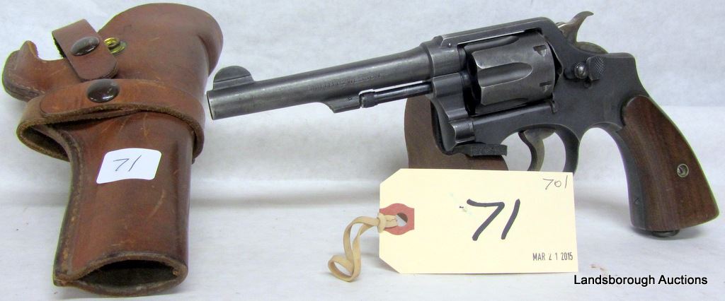 RESTRICTED, REVOLVER, 38 S&W, 127MM BARREL, SN V425137. WOOD GRIPS HAVE A FEW DEEP SCRATCHES, BLUING IS GREY AND FADED, BORE VERY GOOD. COMES WITH LEATHER HOLSTER.