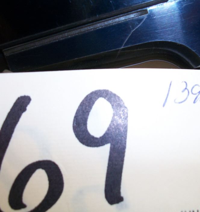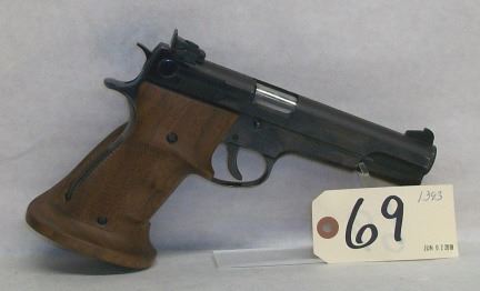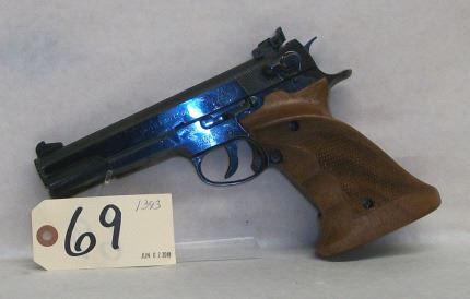 RESTRICTED, SEMI AUTO, 38 SPL, 127MM BARREL, SN# 53645, CUSTOM WOODEN GRIPS ARE IN GOOD SHAPE, BLUING IS FAIR TO GOOD WITH A COUPLE OF SCRATCHES, BORE IS IN VERY GOOD CONDITION, COMES WITH TWO MAGS