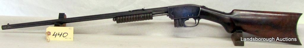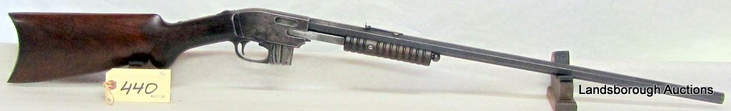 NON-RESTRICTED, PUMP ACTION, 22 CAL, 24" OCTAGONAL BARREL, SN 136592. WOOD HAS A COUPLE DENTS AND SCRATCHES, BLUING IS BROWN, BORE PITTED.
