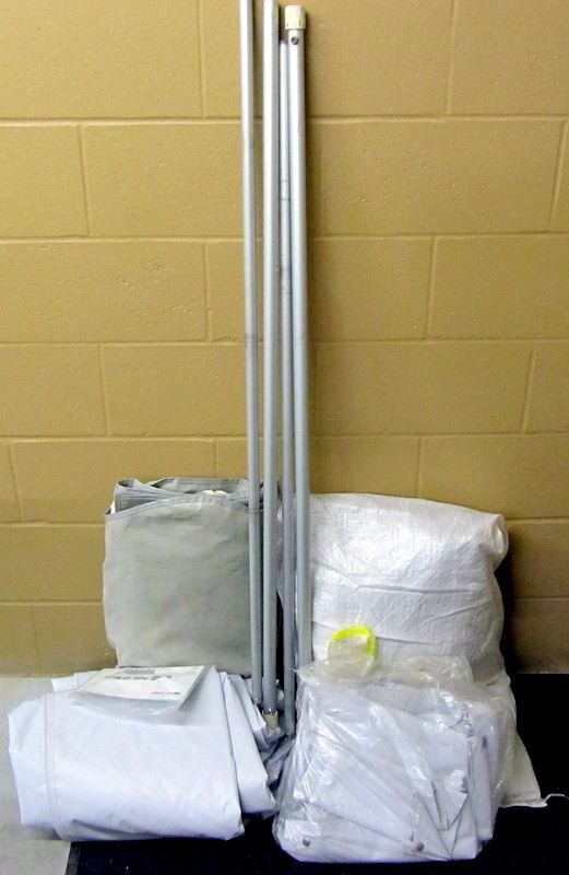 COLLECTION OF SCREEN PANELS, TARPS, AND POLES FOR SETTING UP AN OUTDOOR SCREENED ROOM. PICK UP ONLY, WILL NOT SHIP. INCLUDES AC COVER FOR MOTOR HOME.