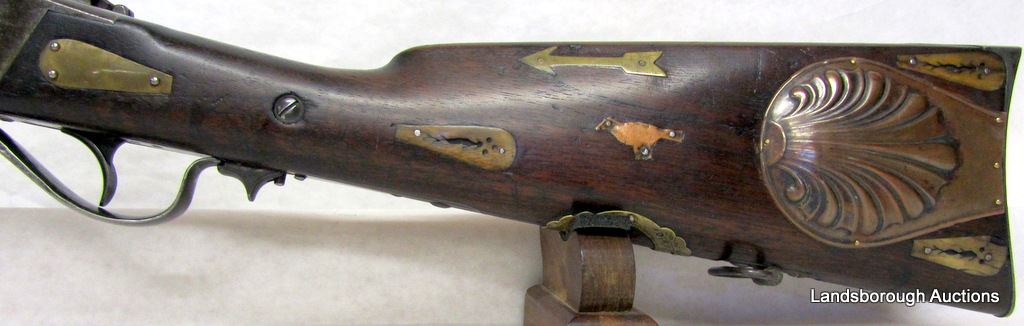 ANTIQUE, SINGLE SHOT, 54 PERCUSSION, 30" BARREL, SN 4539. WOOD INLAYED WITH BONE AND BRASS IMAGES, FOREARM CRACKED AND REPAIRED AHEAD OF RECEIVER, BLUING IS BROWN, BORE PITTED, NO RIFLING. BELIEVED TO BE A CROW INDIAN SCOUT RIFLE USED WHILE WORKING FOR THE US CALVARY. BONE INLAY BELIEVED TO BE DONE BY THE SCOUT, MEANING OF INLAYS UNKNOWN.