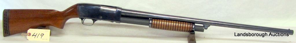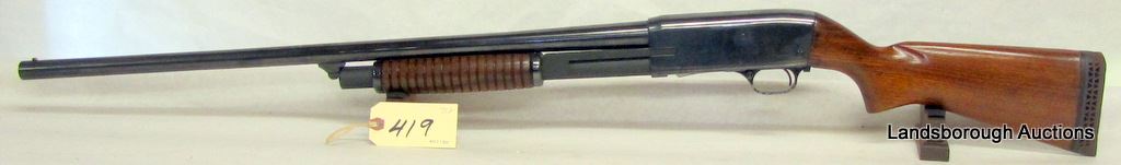 NON-RESTRICTED, PUMP ACTION, 12GA X 2 3/4", 28" BARREL WITH FIXED FULL CHOKE, SN 38264. WOOD REFINISHED, BLUING HAS SOME SCRATCHES AND MARKS, BORE GOOD.
