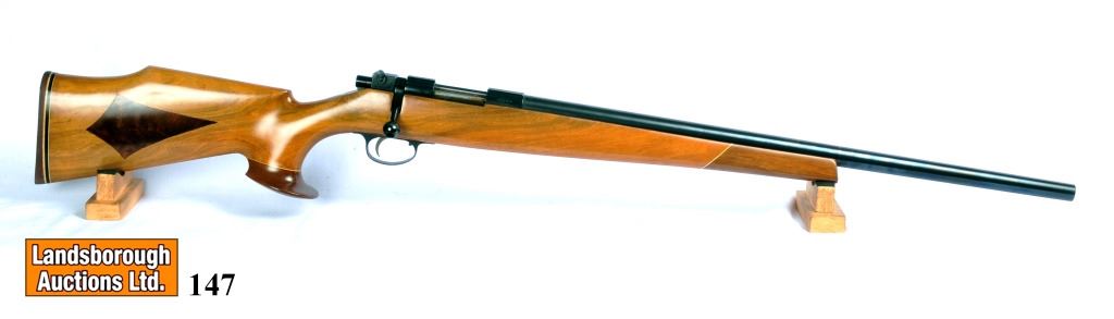 Non-restricted, bolt action, 222 cal., 24" bull barrel, SN 42772, wood is a custom made monte carlo style stock in very good condition with a couple of runs in the finish, bluing is very good, bore is measure, breach grease, funnel.