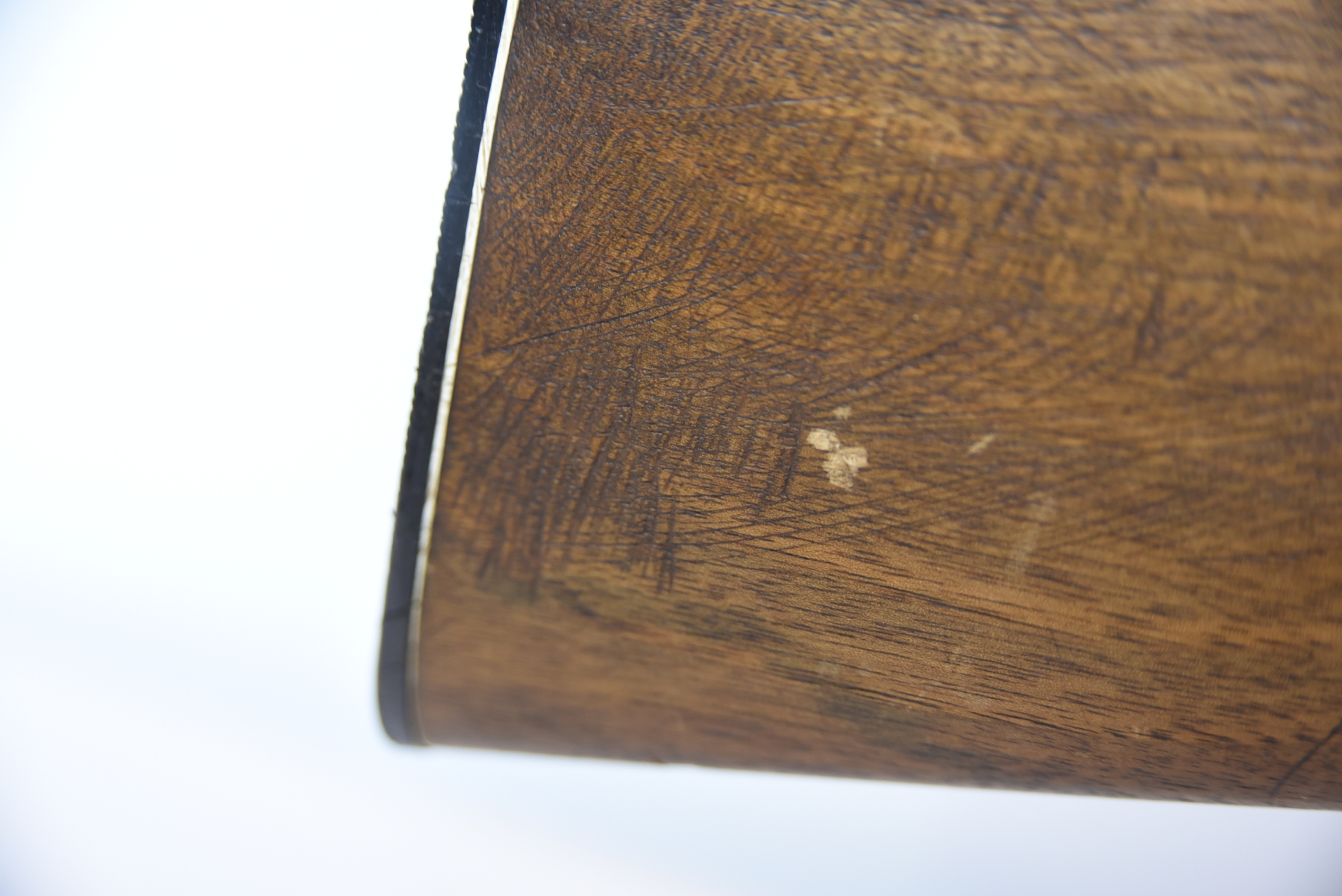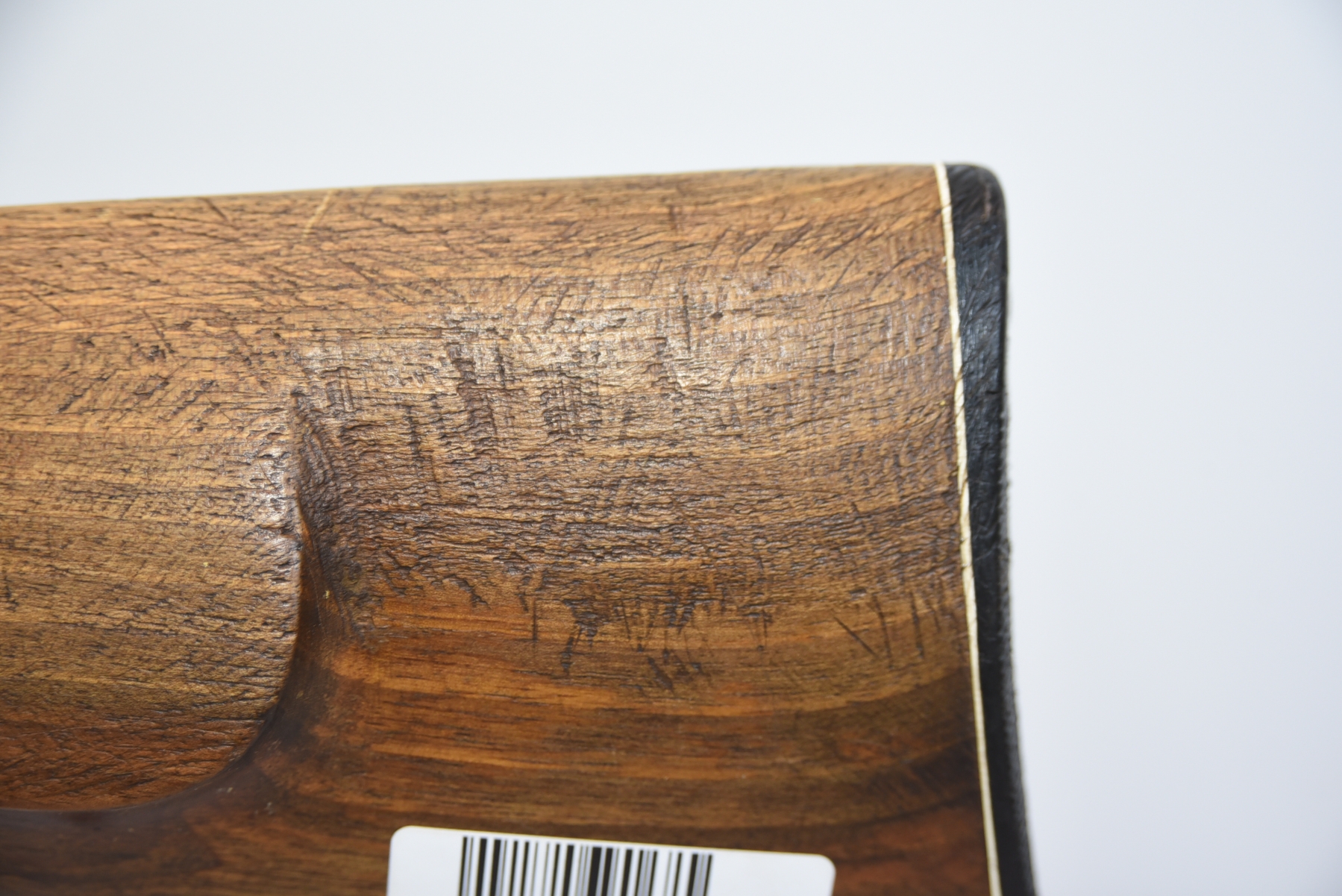 Wood stock shows small cracks on left and right side of the stock, a crack on the upper tang, there are scratches, scuffs, some dents; condition is less than fair.