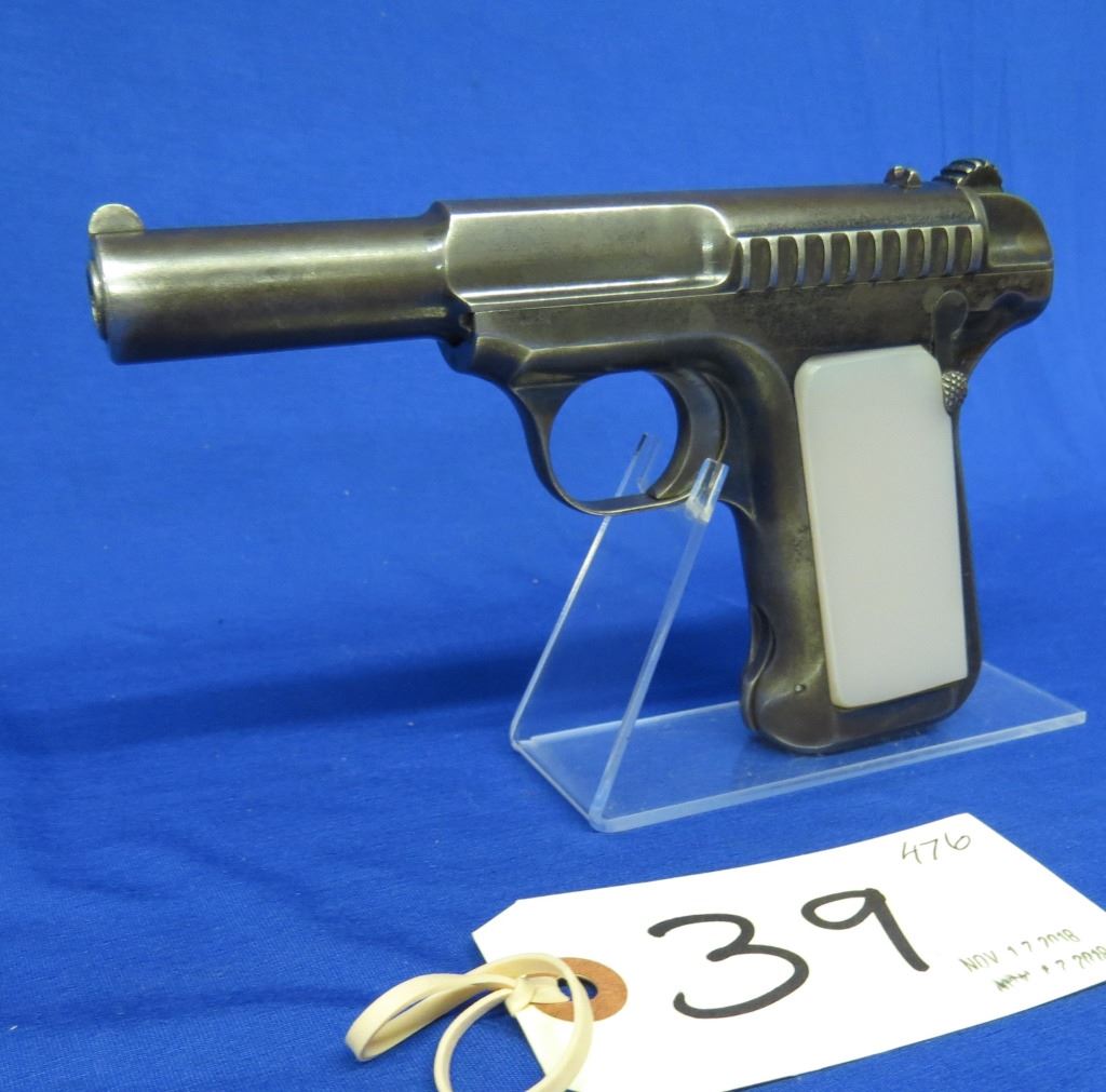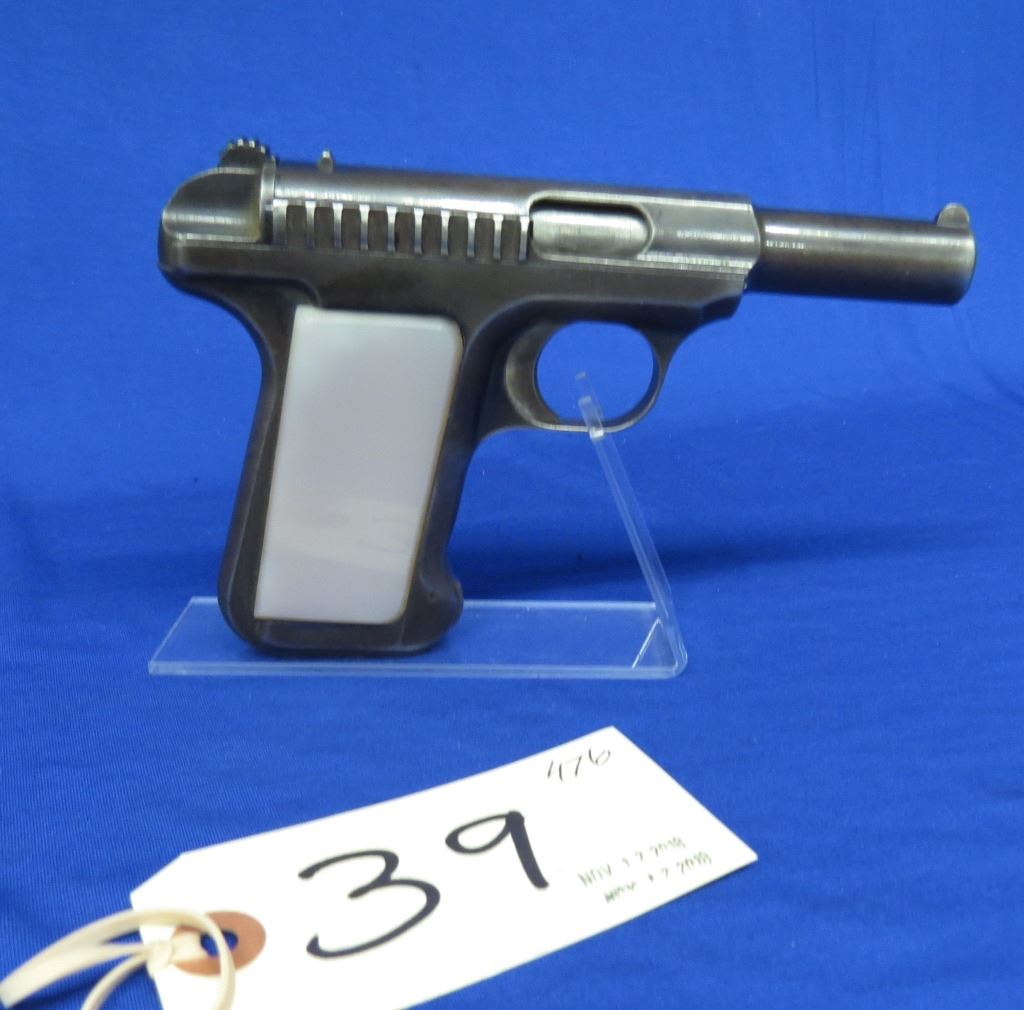 Prohibited, semi auto, 32 ACP, 93mm barrel, SN 19162. White plastic grips, bluing is grey and worn, bore good.